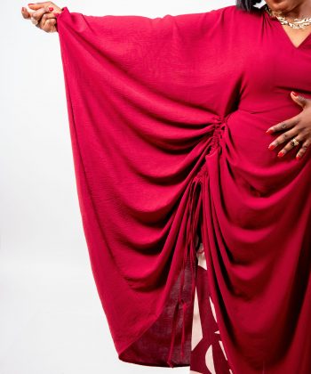 La tunique longue bordeaux présente un drapé spectaculaire, travaillé sur le côté avec un joli système de liens pour un effet plissé très chic. Sa coupe fluide et son col en V délicat mettent