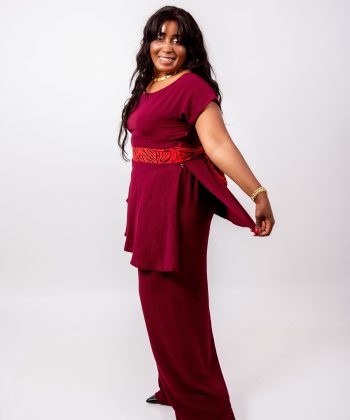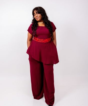 Ce superbe ensemble bordeaux se compose d’un haut fluide asymétrique, pensé pour flatter la silhouette tout en offrant une grande liberté de mouvement. Le haut est sublimé par une ceinture