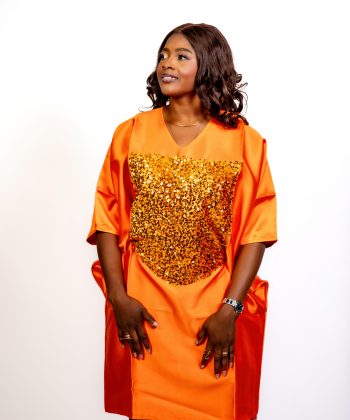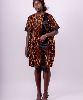 Confectionnée dans un tissu wax riche aux tons orange, noir et doré, cette robe offre un style vibrant et chic, parfait pour les sorties, cérémonies, anniversaires, ou