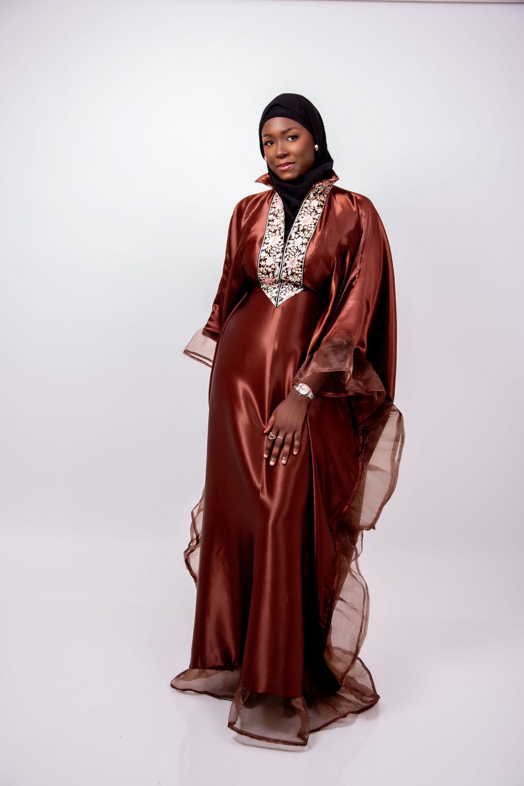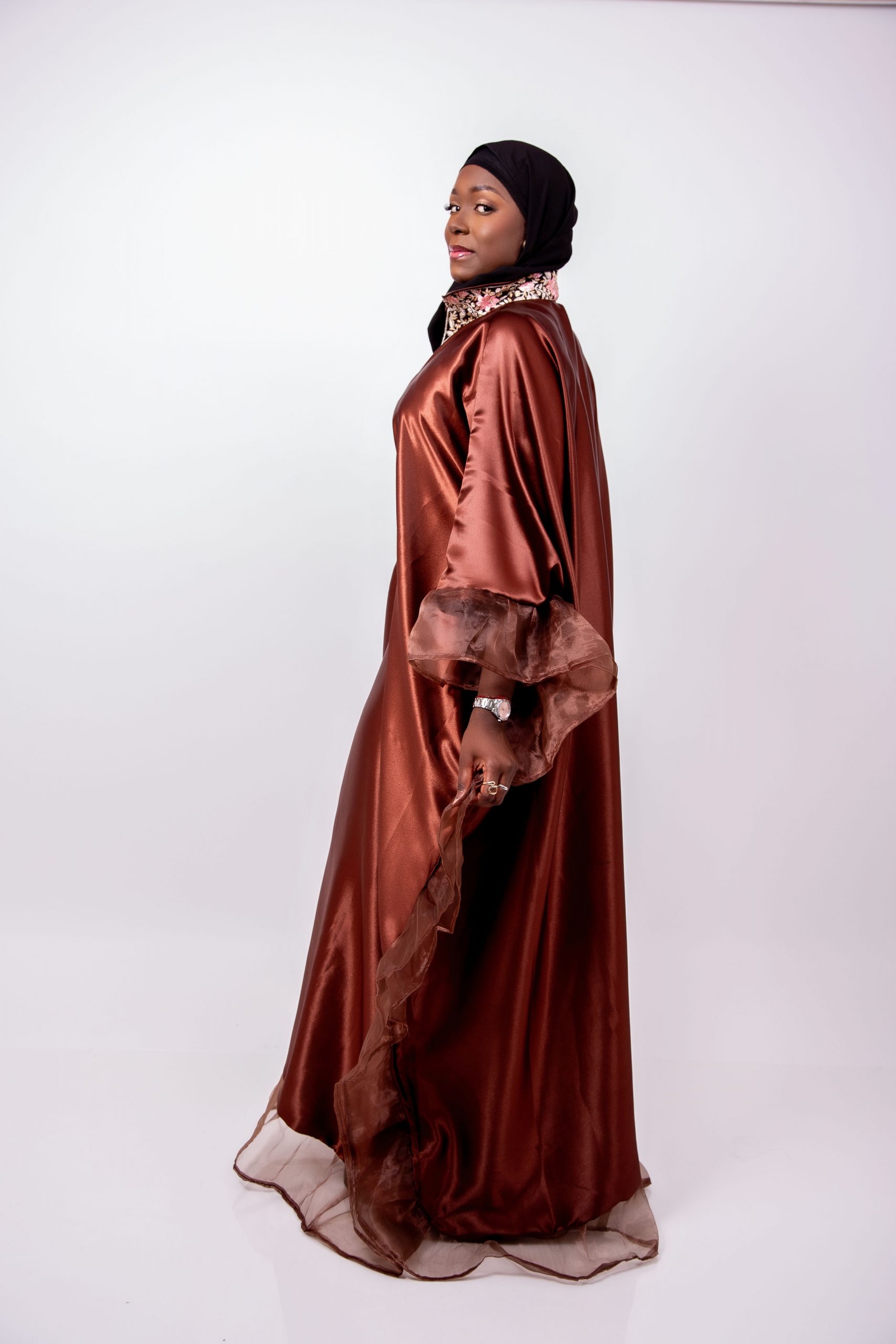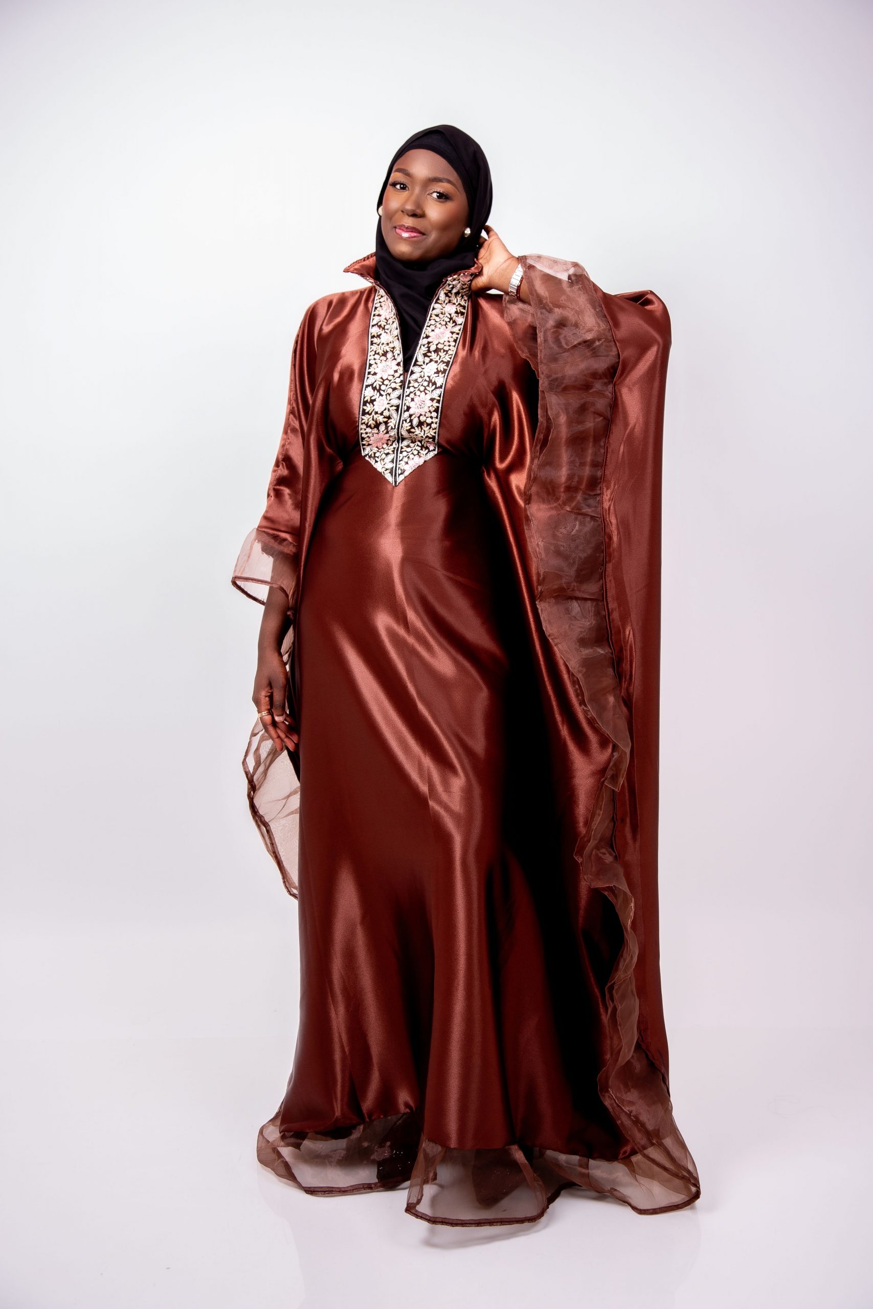 Laissez-vous séduire par Leila, un boubou majestueux qui allie douceur, fluidité et raffinement. Conçu dans un tissu satiné marron légèrement brillant, Leila offre une allure noble et féminine grâce à sa coupe ample et gracieuse.