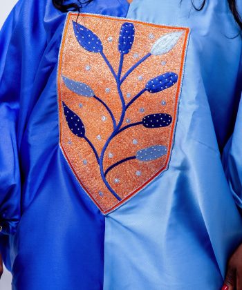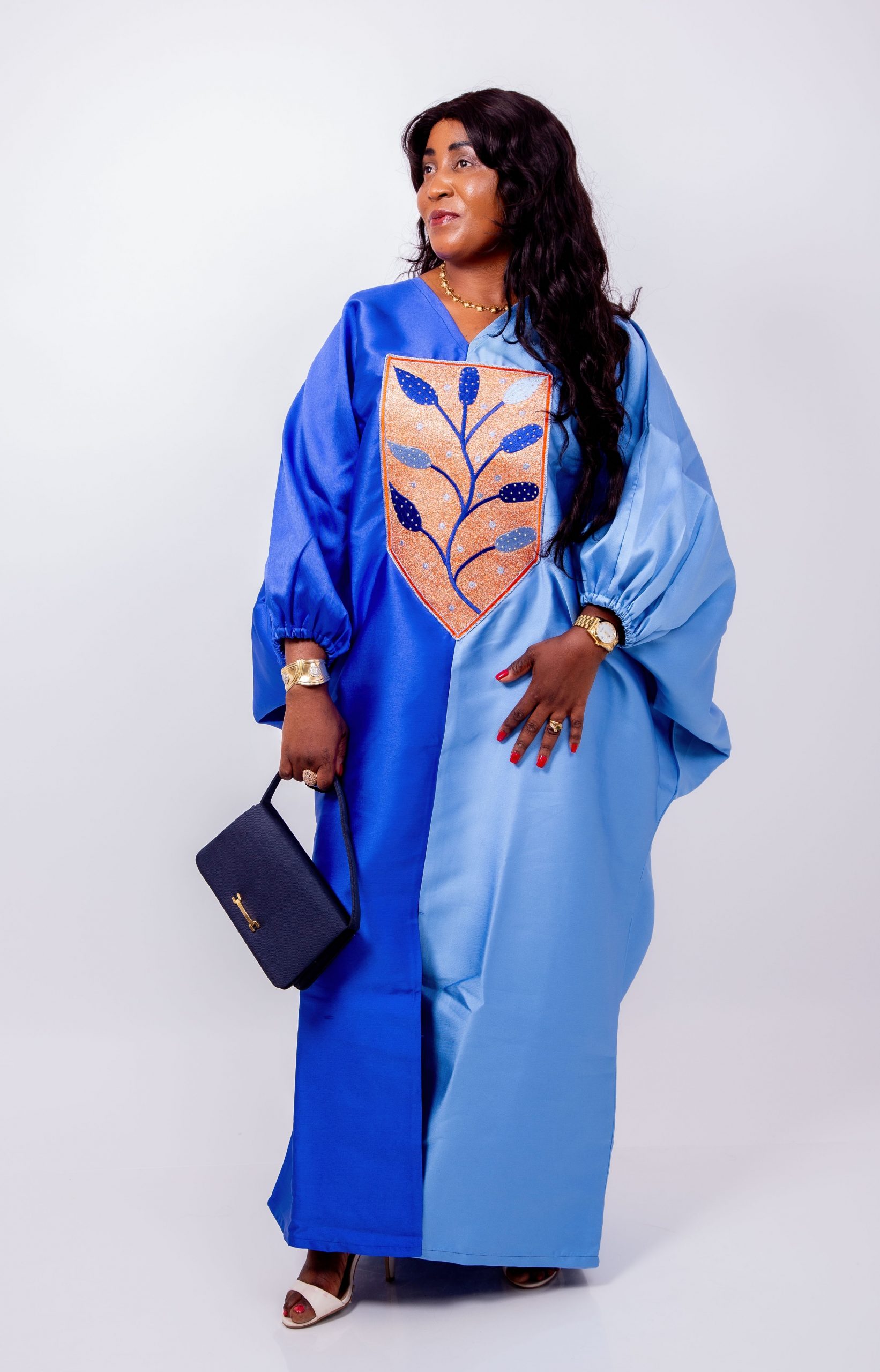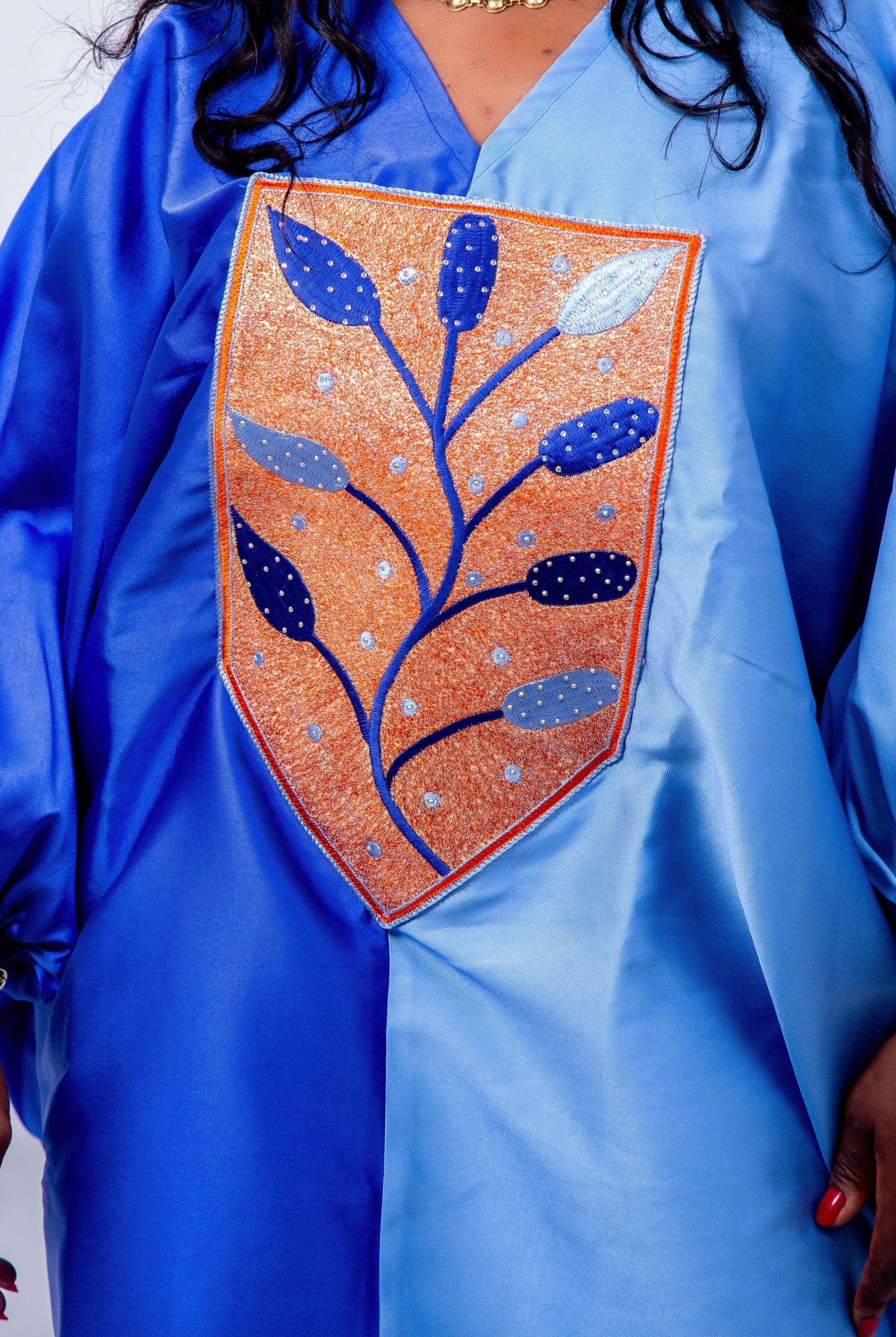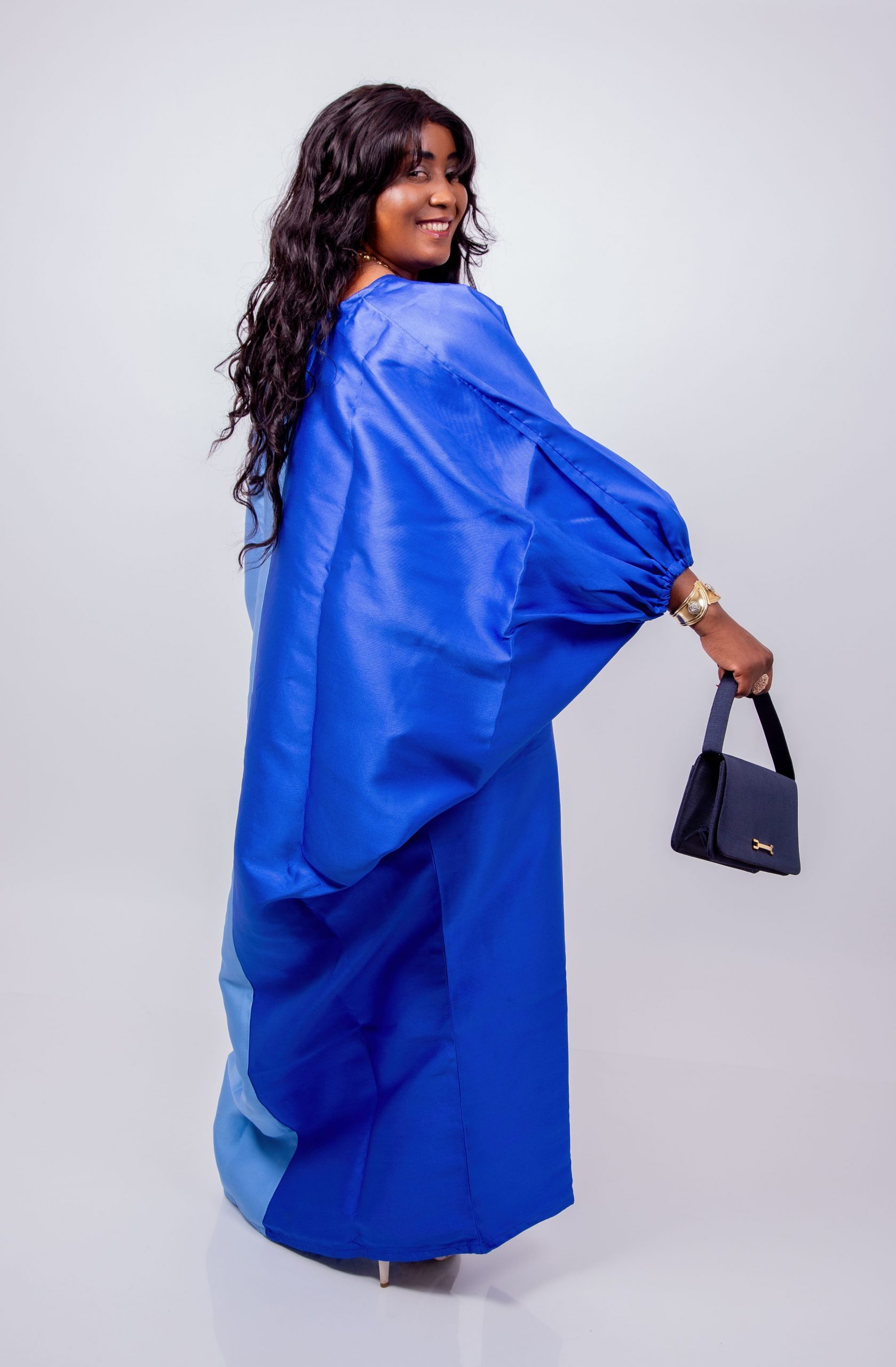 Ce boubou est confectionné dans un tissu satiné de haute qualité, offrant un tombé fluide et une brillance subtile. Son design bicolore, mêlant un bleu royal profond à un bleu ciel doux, crée un contraste harmonieux et très chic.