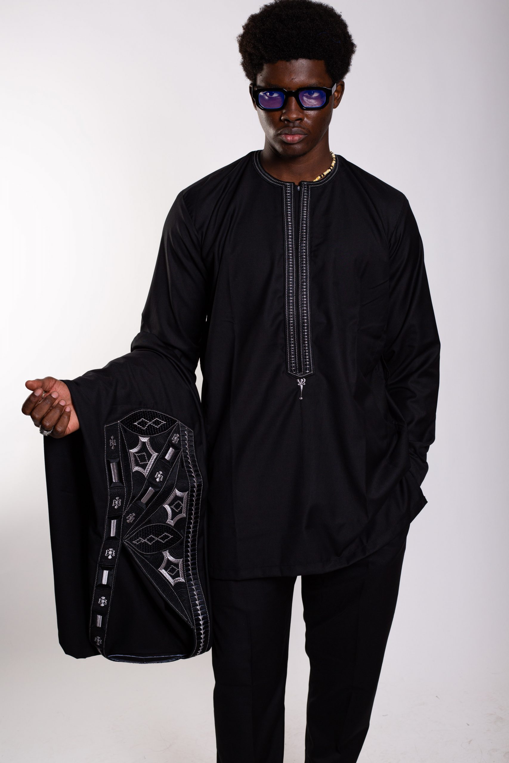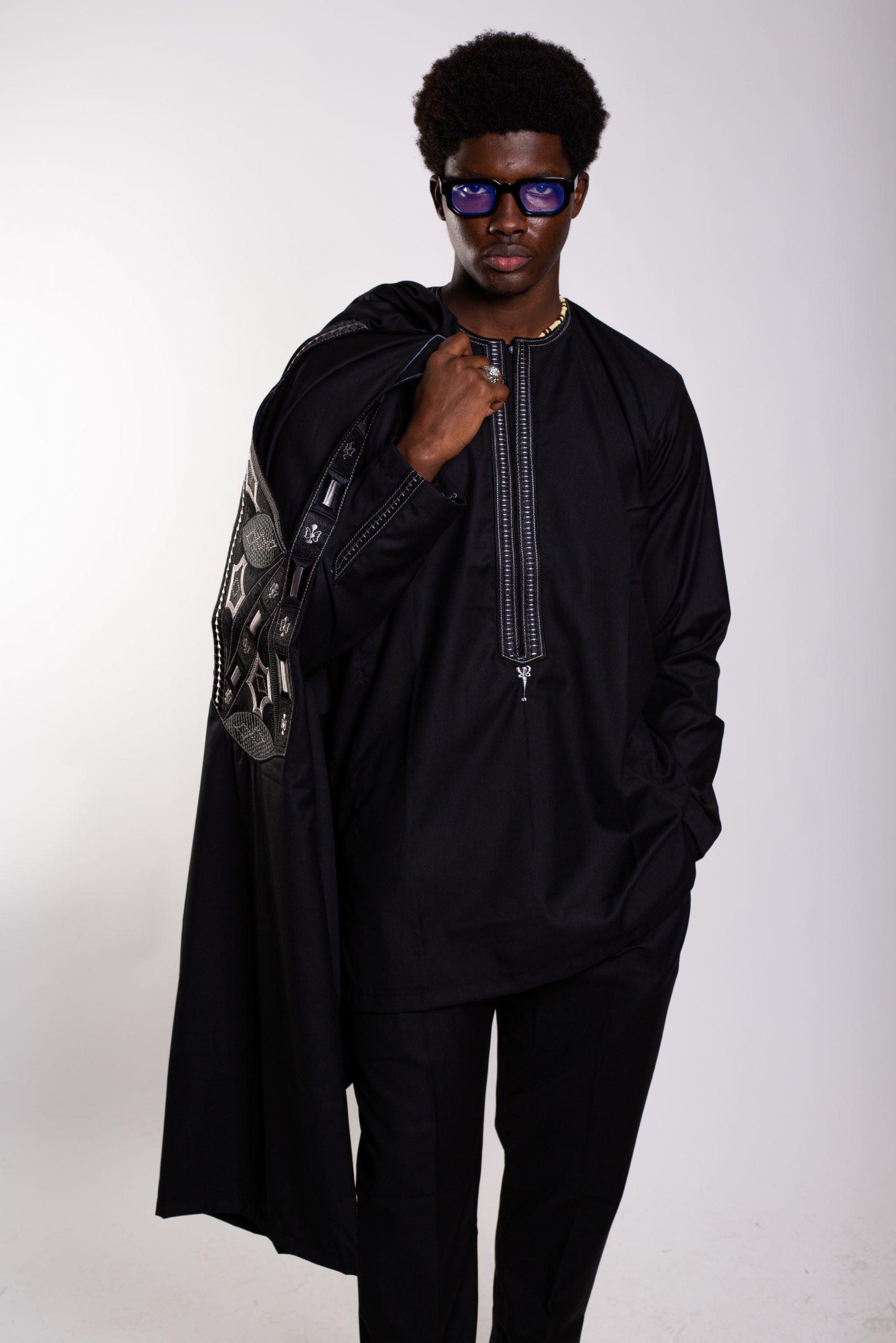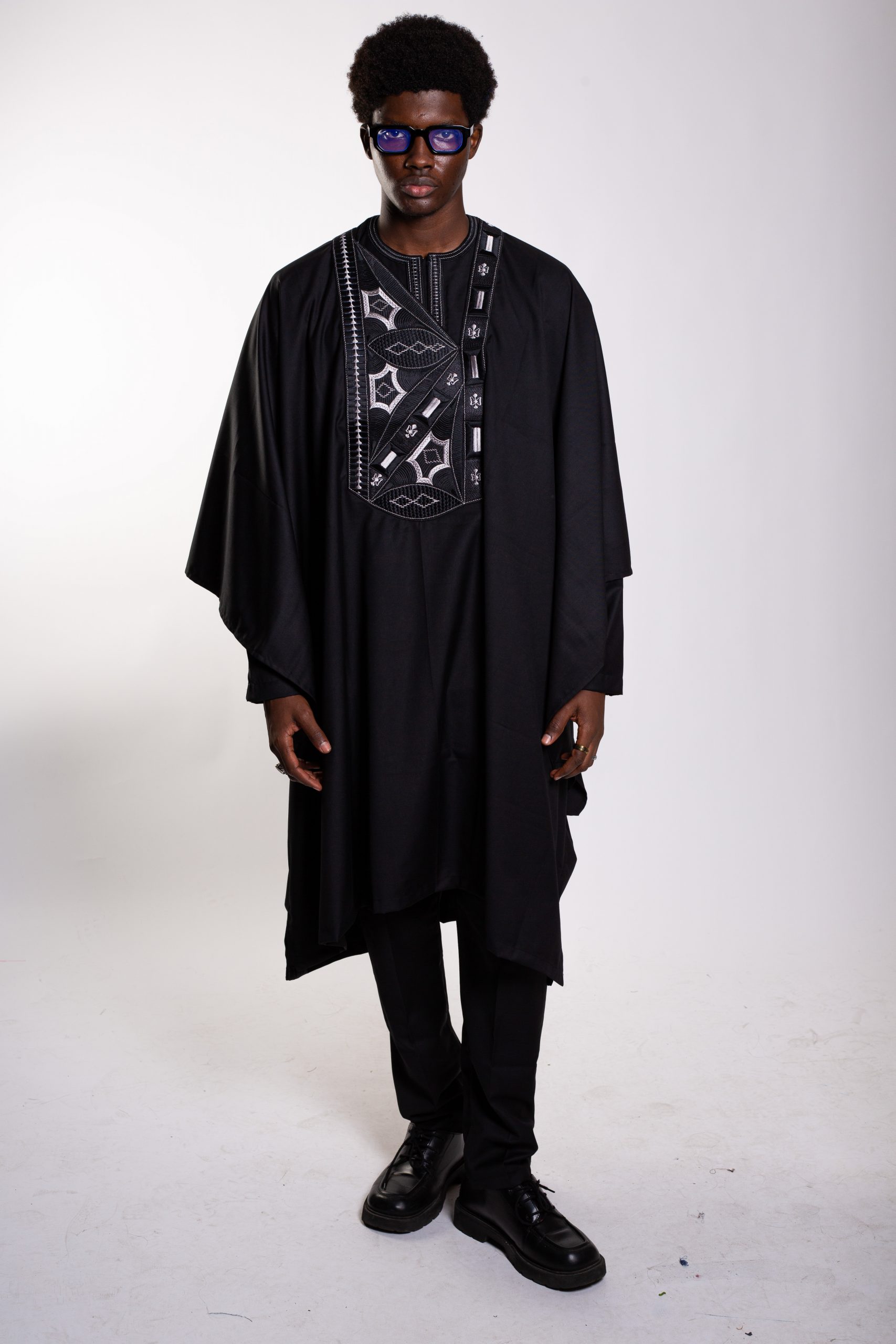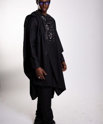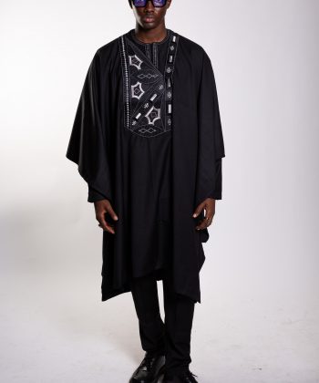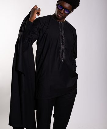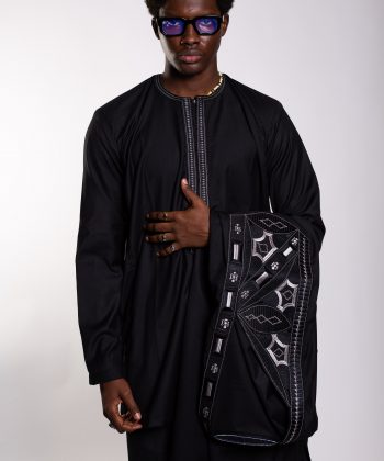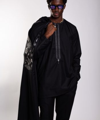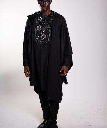 Un boubou ample, pièce maîtresse de l’ensemble, sublimé par une broderie soignée et symétrique, symbole d’élégance africaine intemporelle.