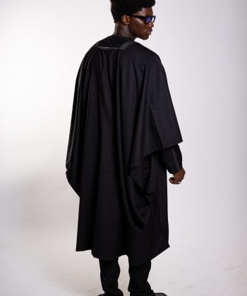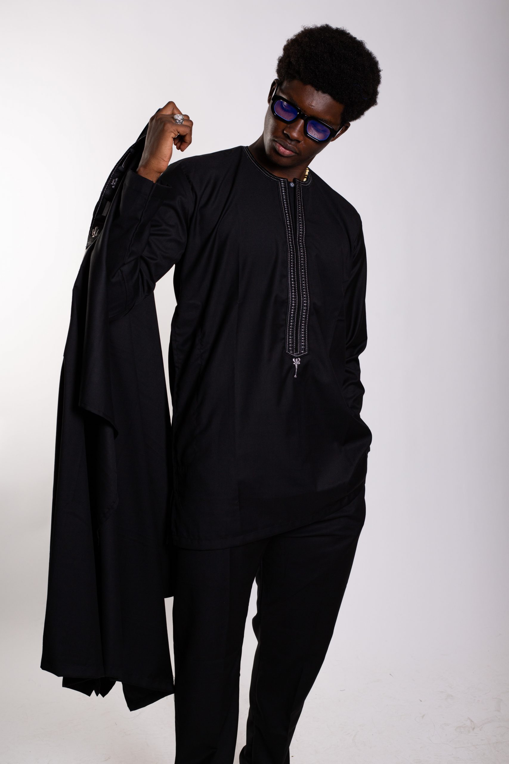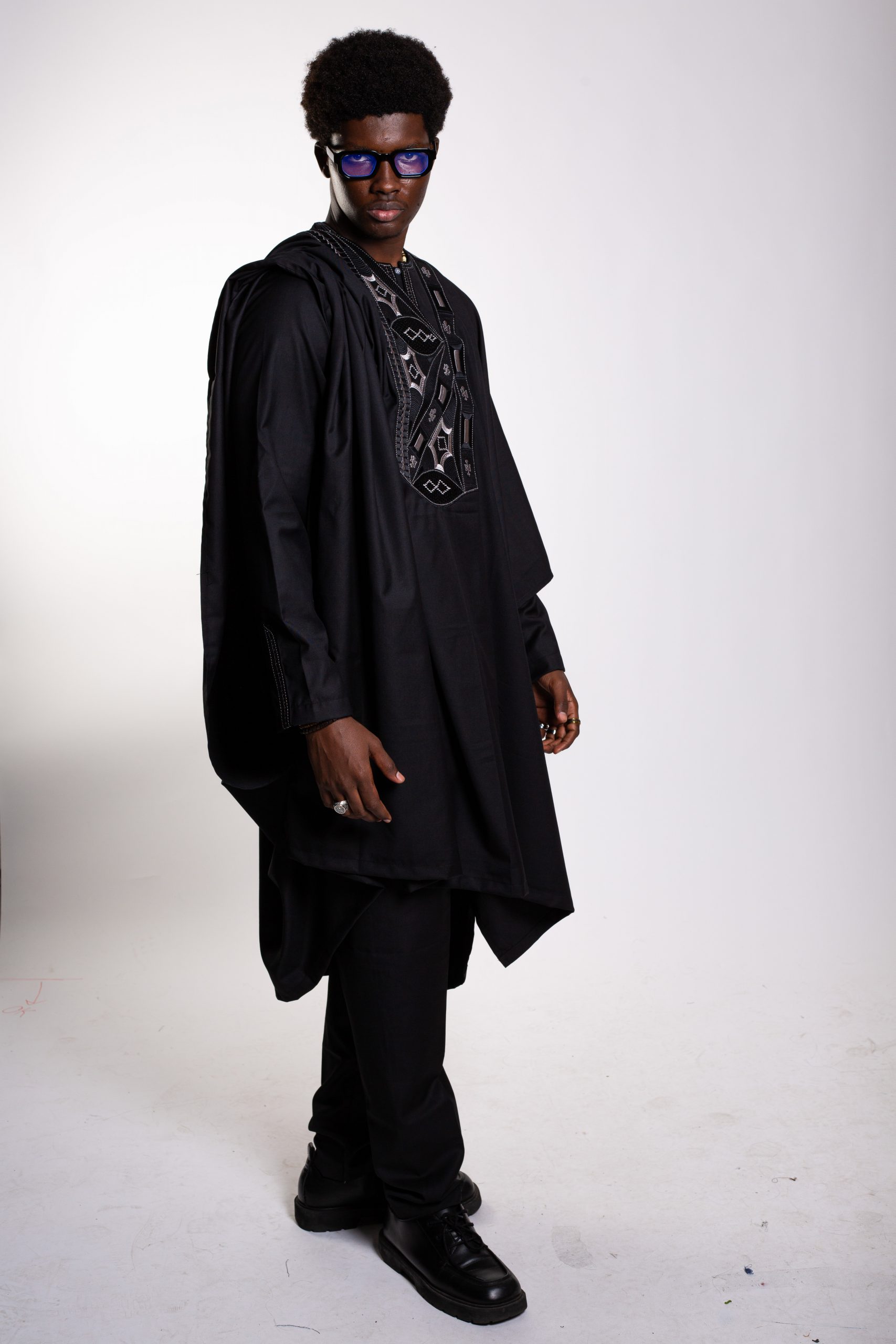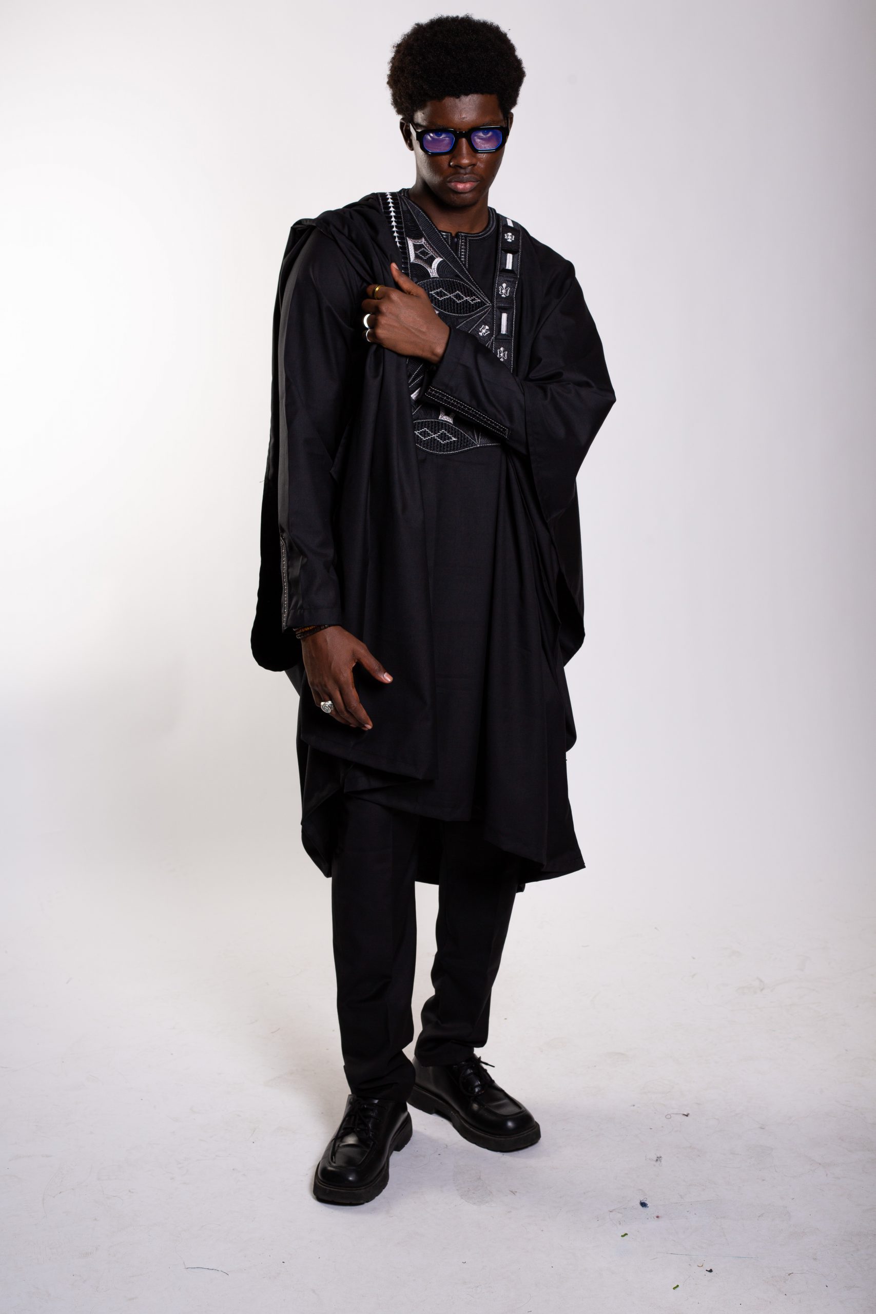 Un boubou ample, pièce maîtresse de l’ensemble, sublimé par une broderie soignée et symétrique, symbole d’élégance africaine intemporelle.