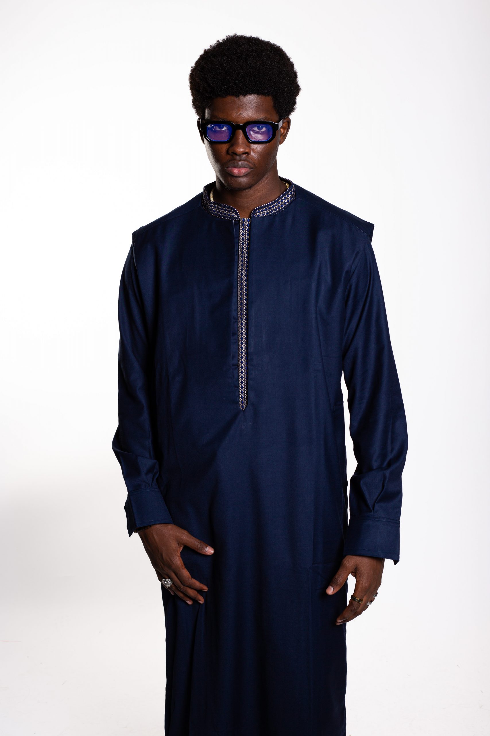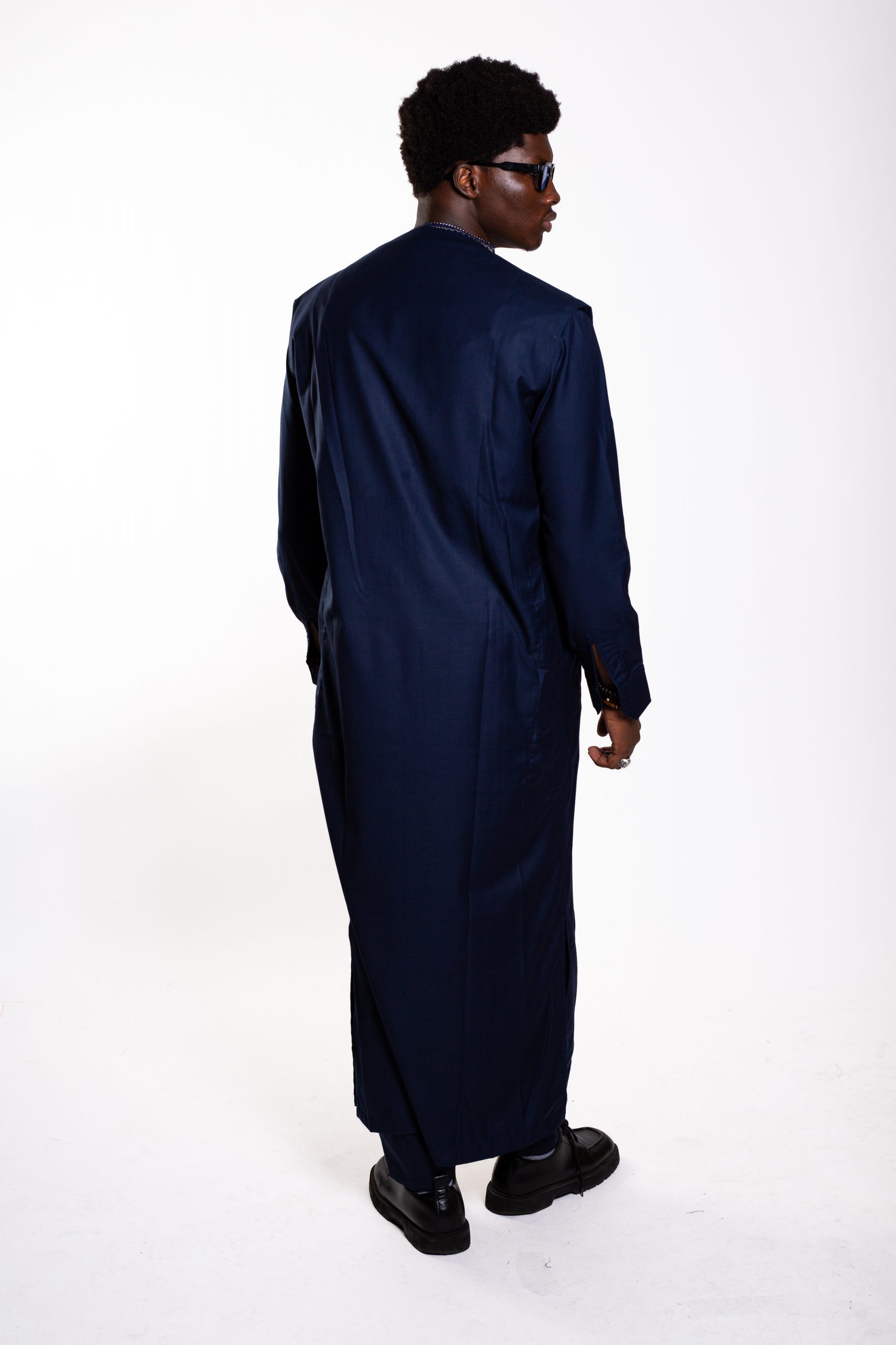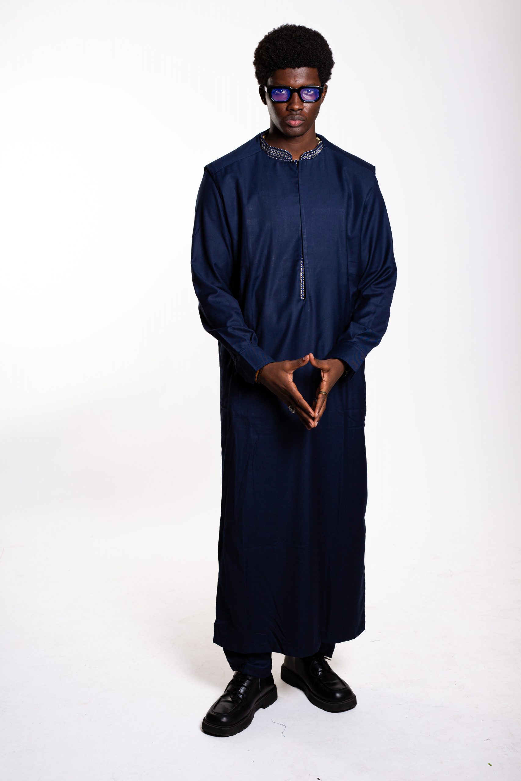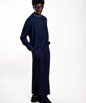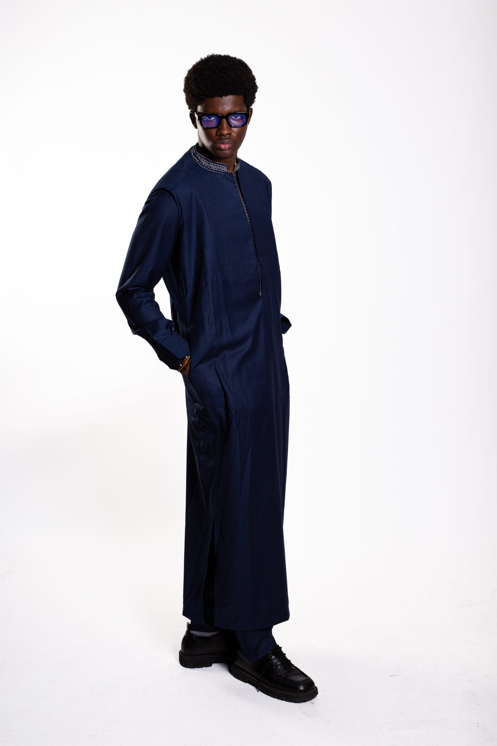 Conçu dans un tissu de haute qualité, cet ensemble offre un tombé impeccable, une allure majestueuse et un confort optimal. Sa couleur bleu nuit profonde apporte sophistication et sobriété, adaptée à tous les styles.