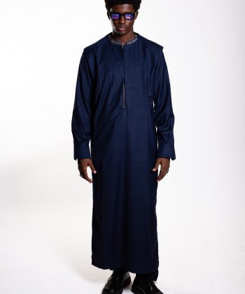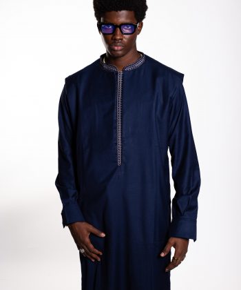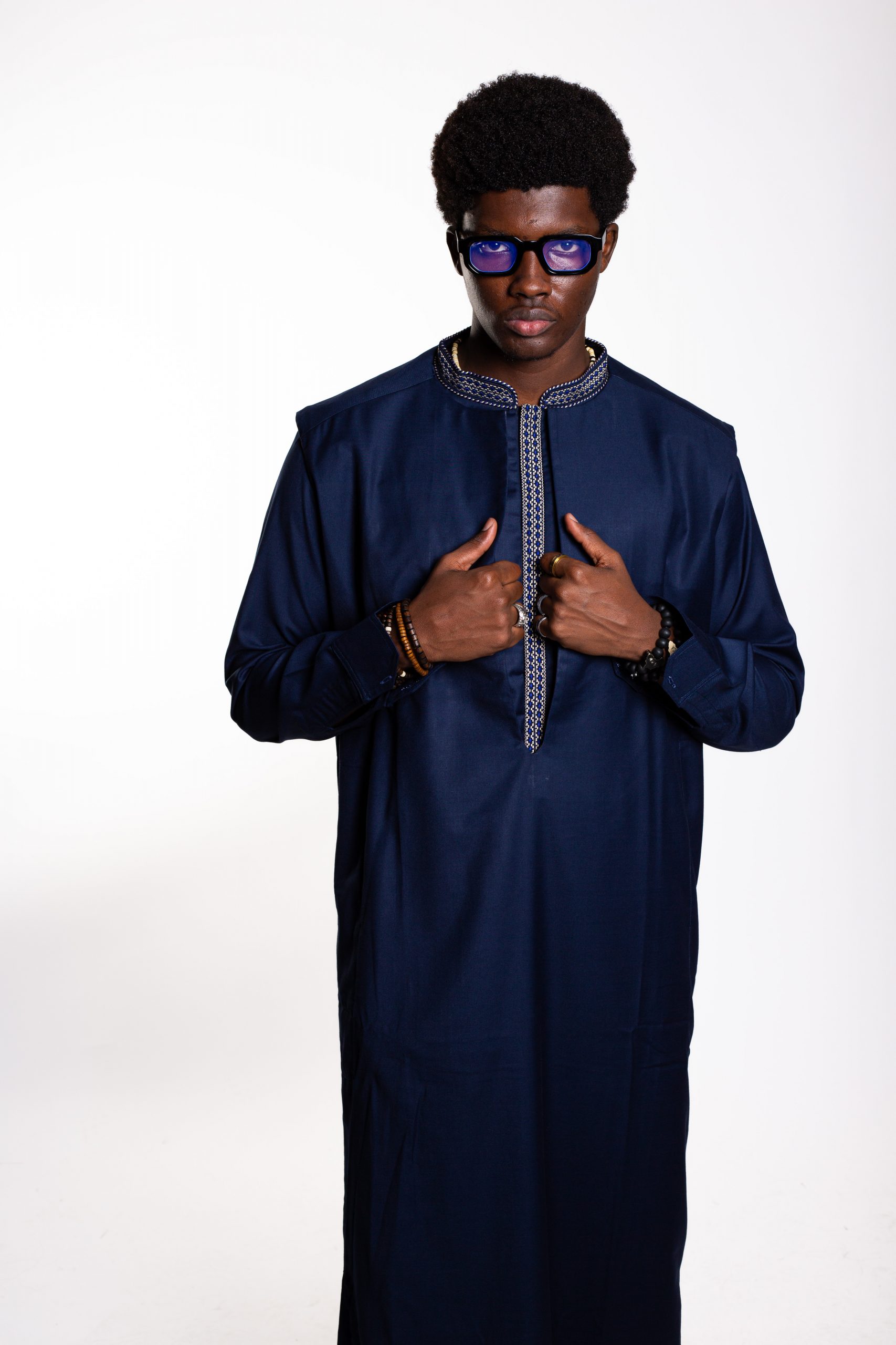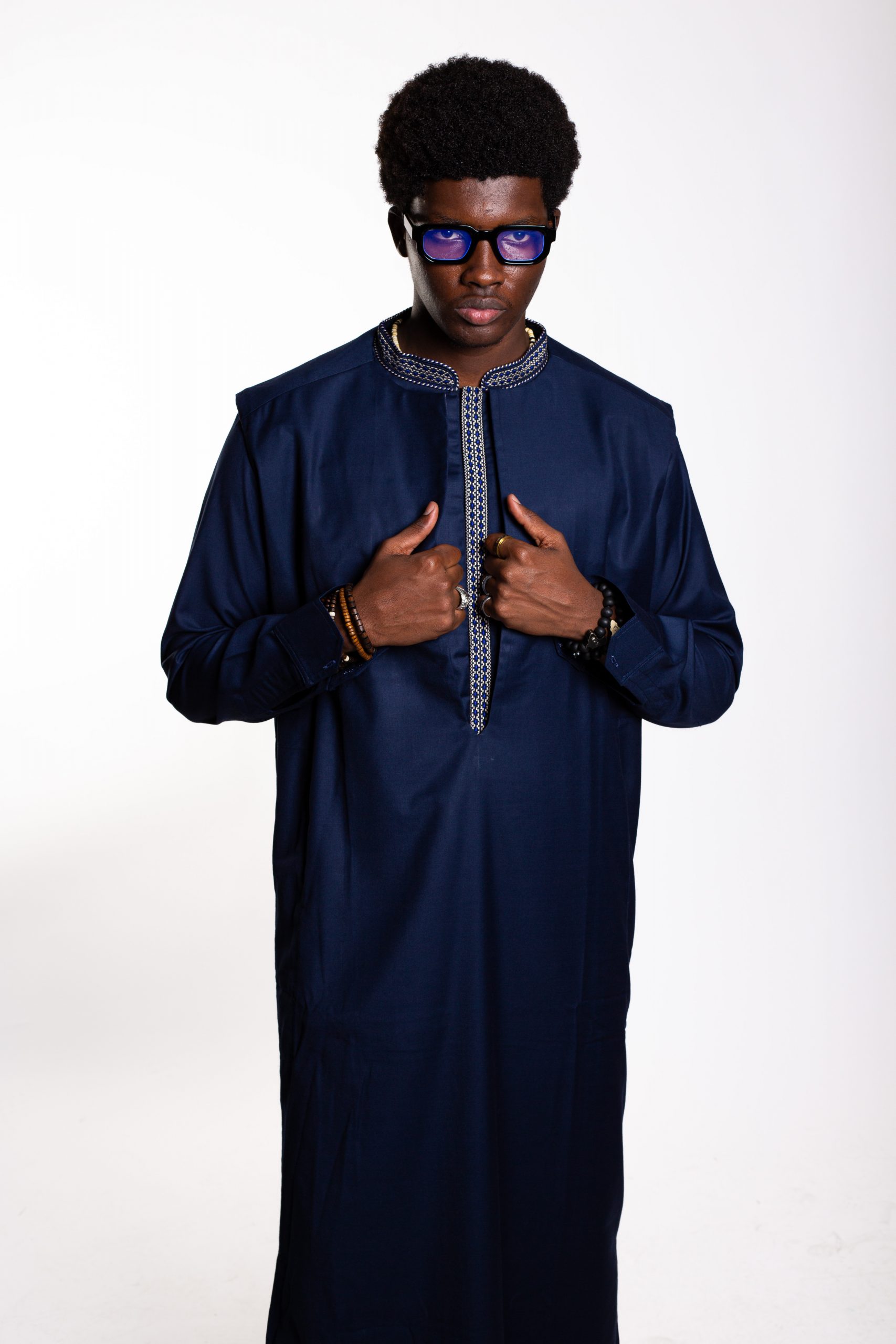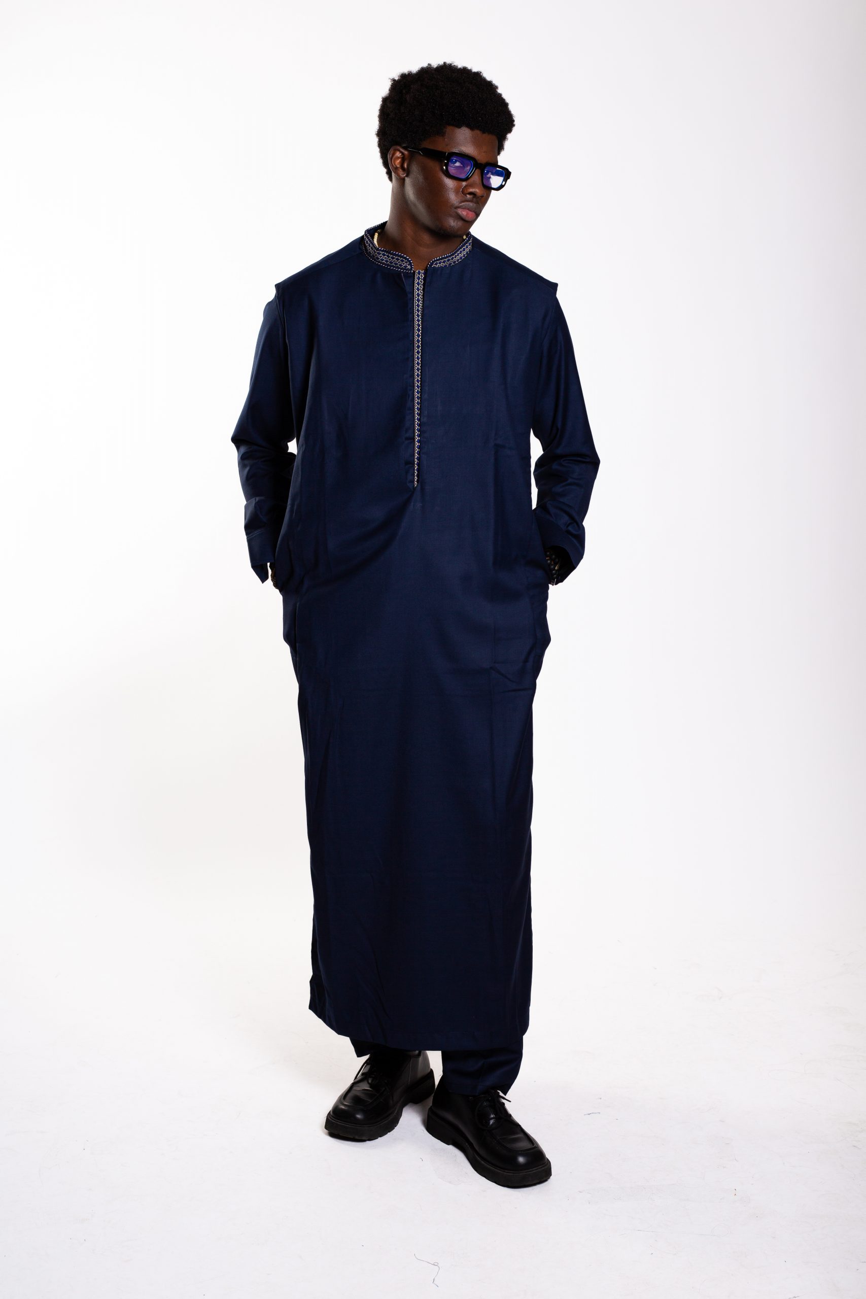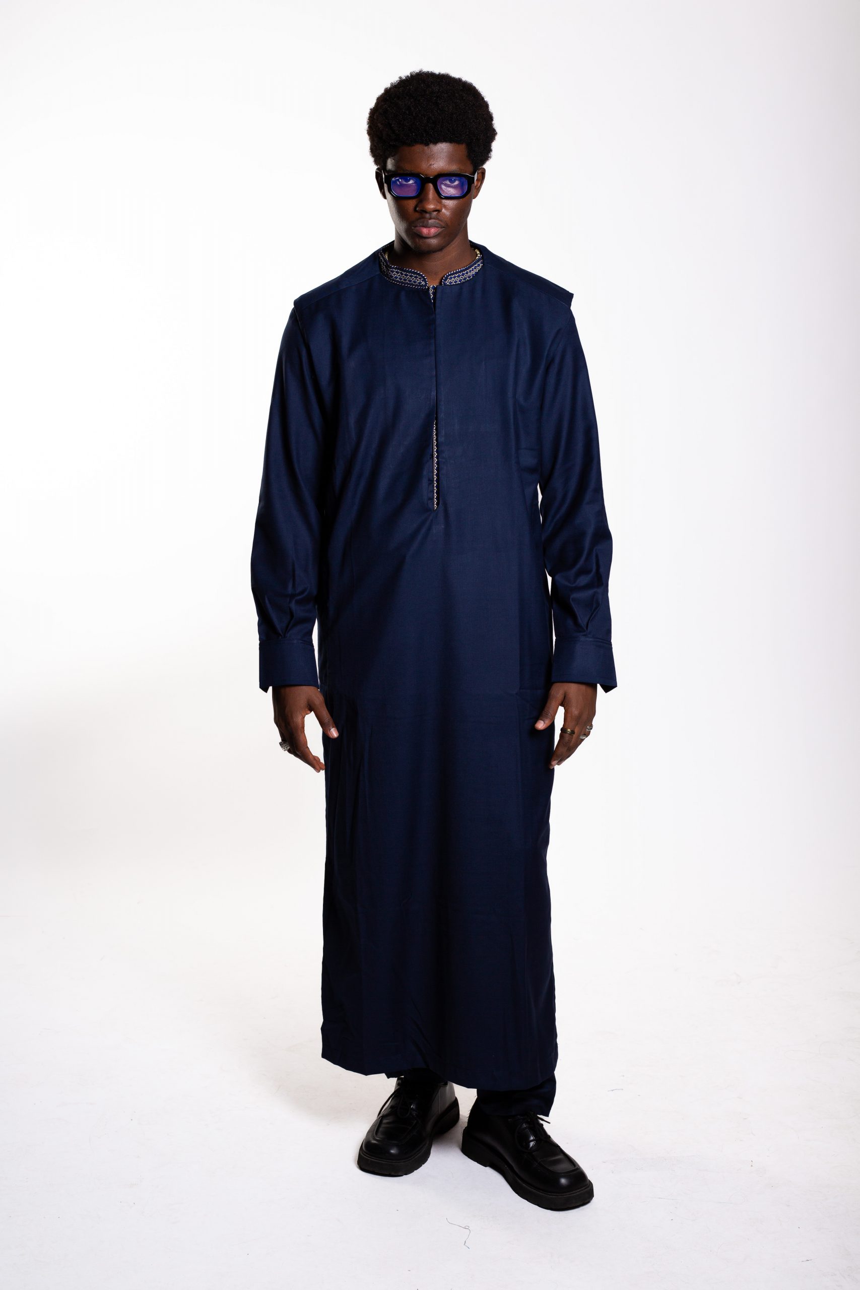 Conçu dans un tissu de haute qualité, cet ensemble offre un tombé impeccable, une allure majestueuse et un confort optimal. Sa couleur bleu nuit profonde apporte sophistication et sobriété, adaptée à tous les styles.
