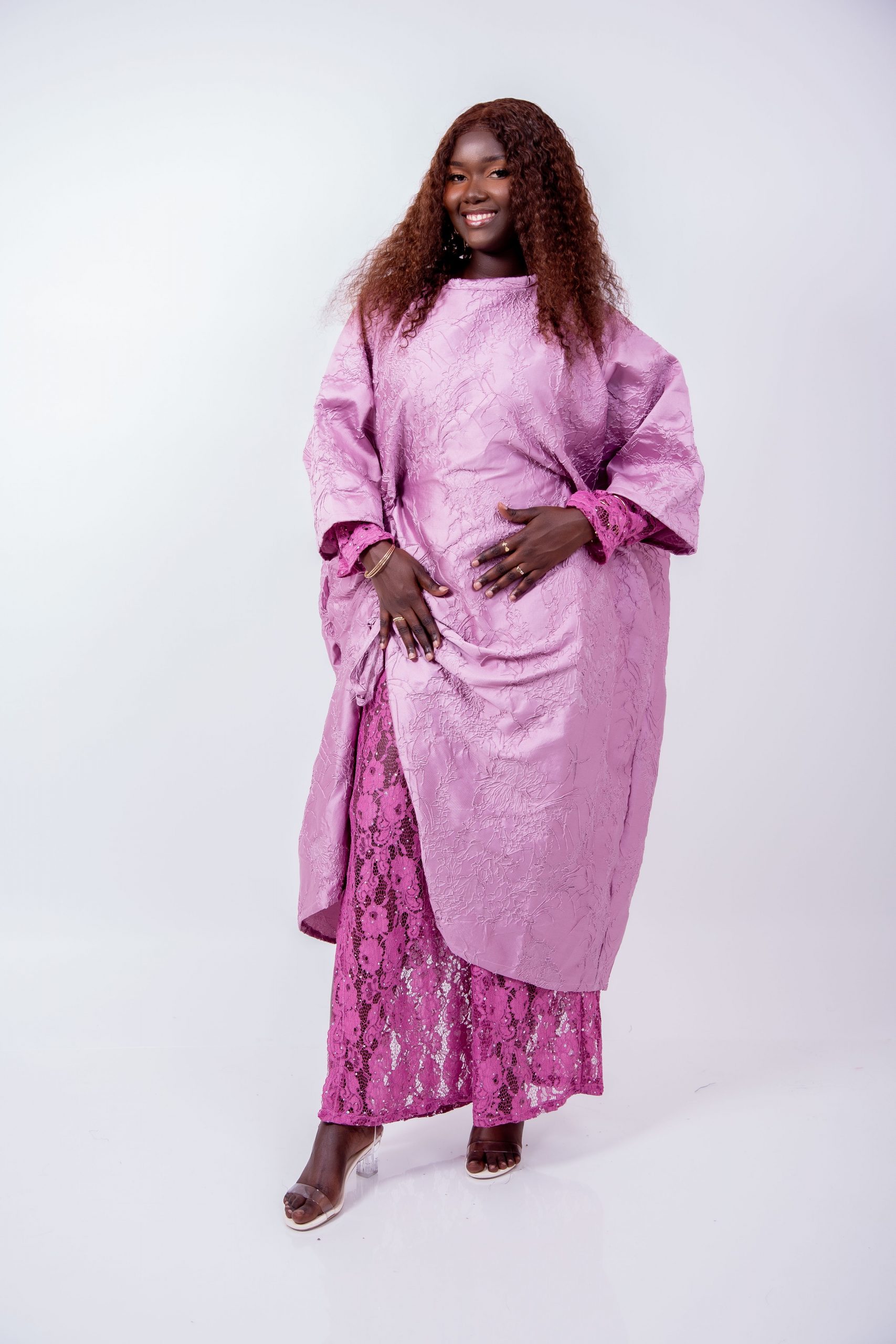 ✨ Une jupe longue en dentelle haut de gamme, d’un rose plus intense, apportant transparence maîtrisée, charme et sophistication. La fente sur le côté assure un mouvement fluide et une allure gracieuse.