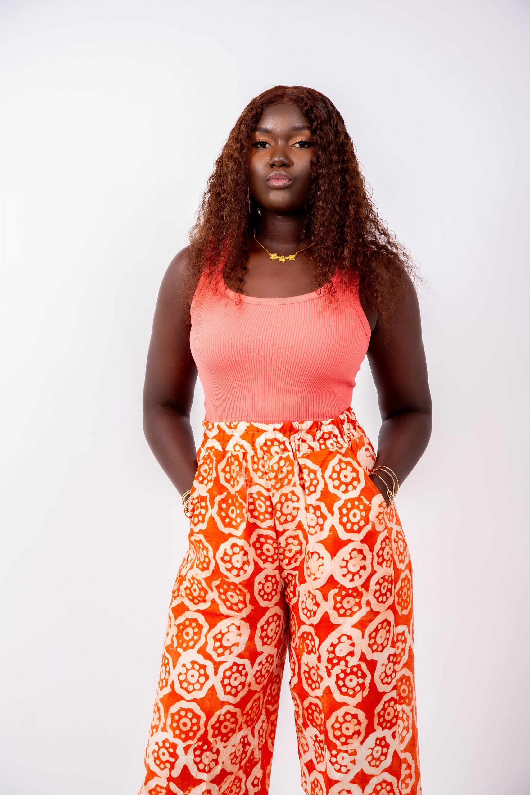 Thina-Fashion – Ensemble Femme Wax Orange & Blanc | Pantalon Fluide & Haut Stretch Corail