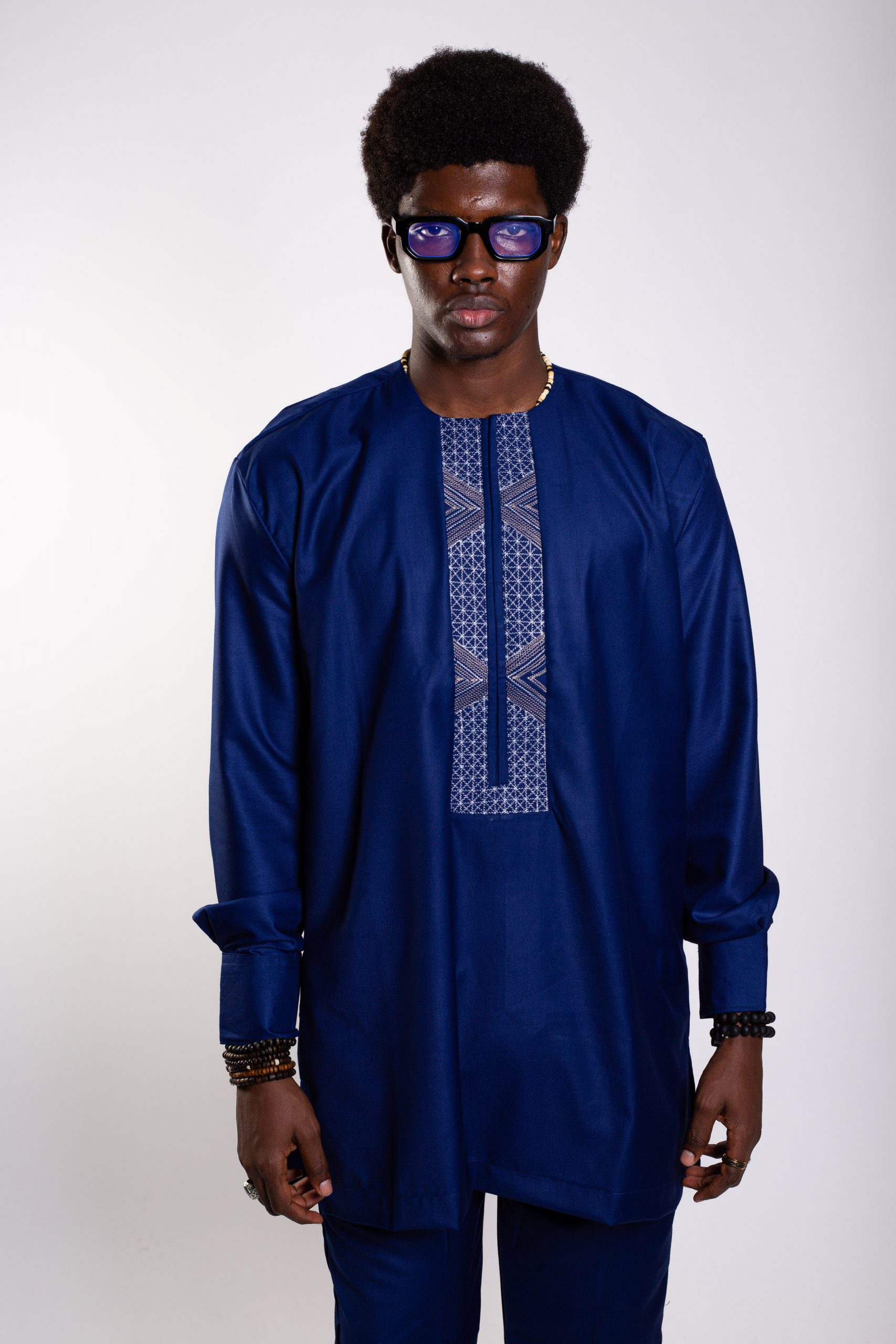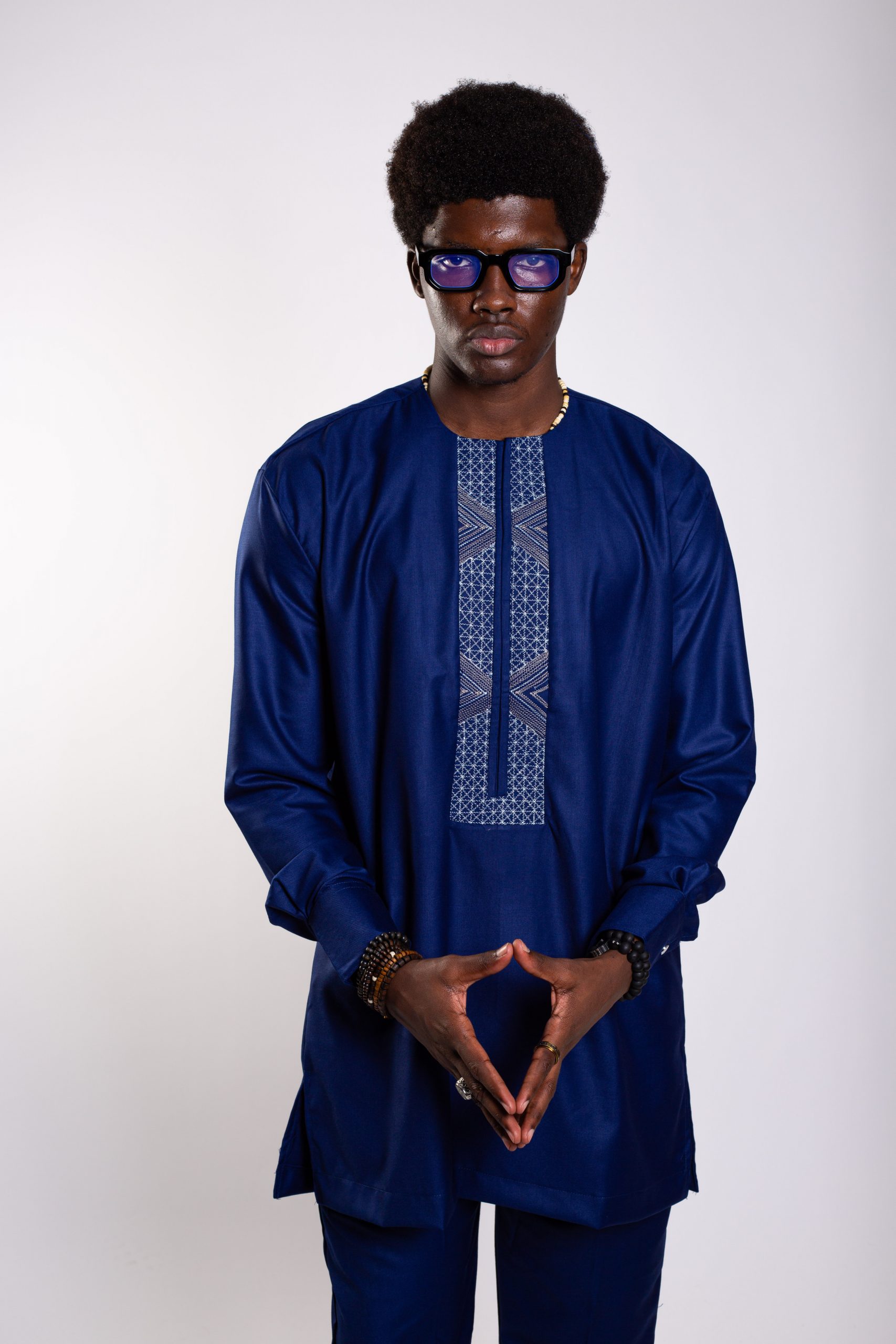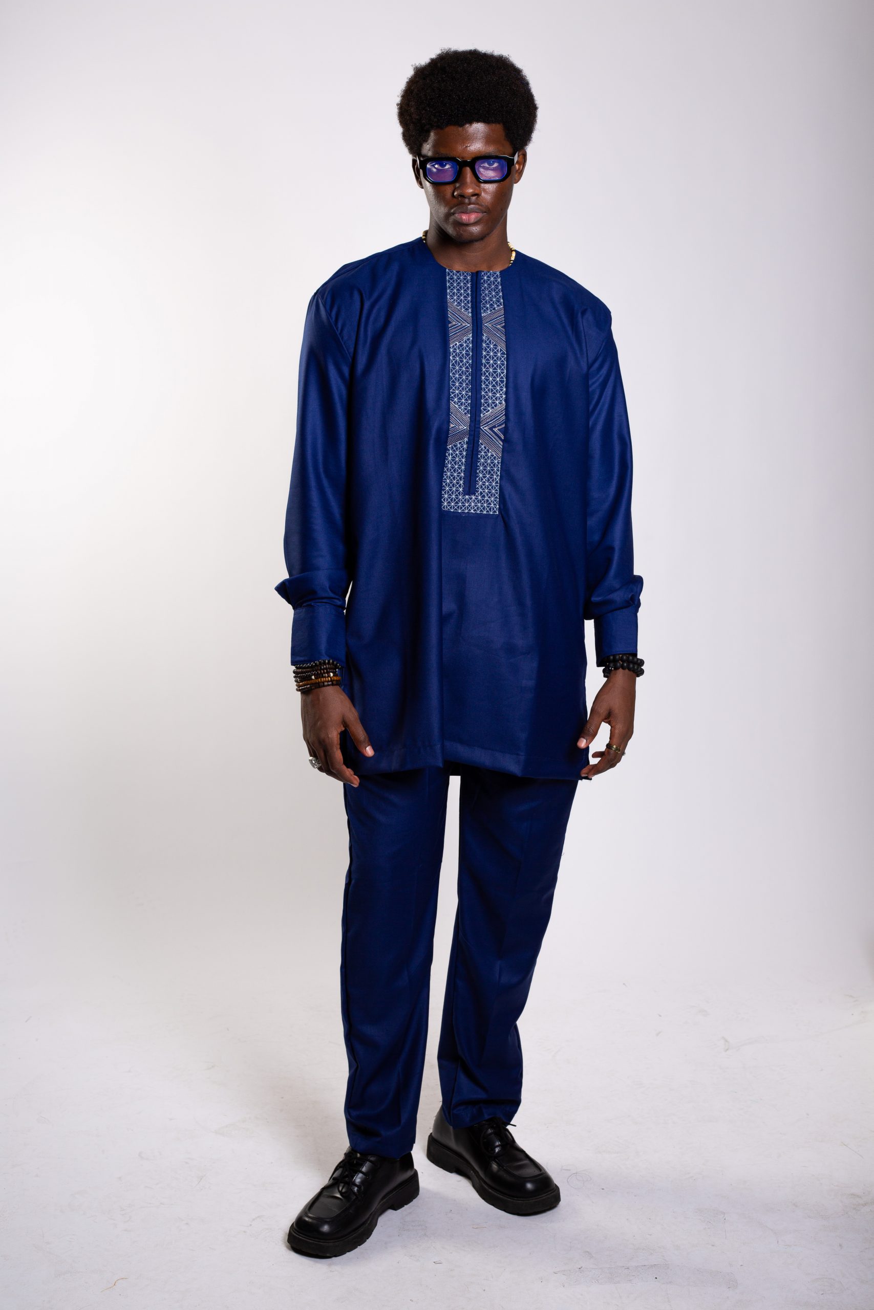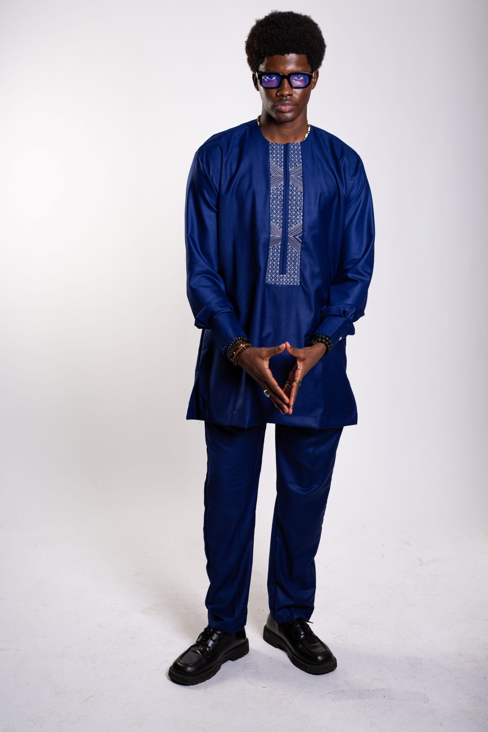 La tunique bleu roi, subtilement satinée, est ornée d’une broderie géométrique raffinée, soigneusement positionnée au centre pour apporter distinction et caractère. Le pantalon assorti complète parfaitement la silhouette pour un rendu homogène, chic et élégant.