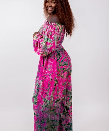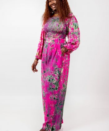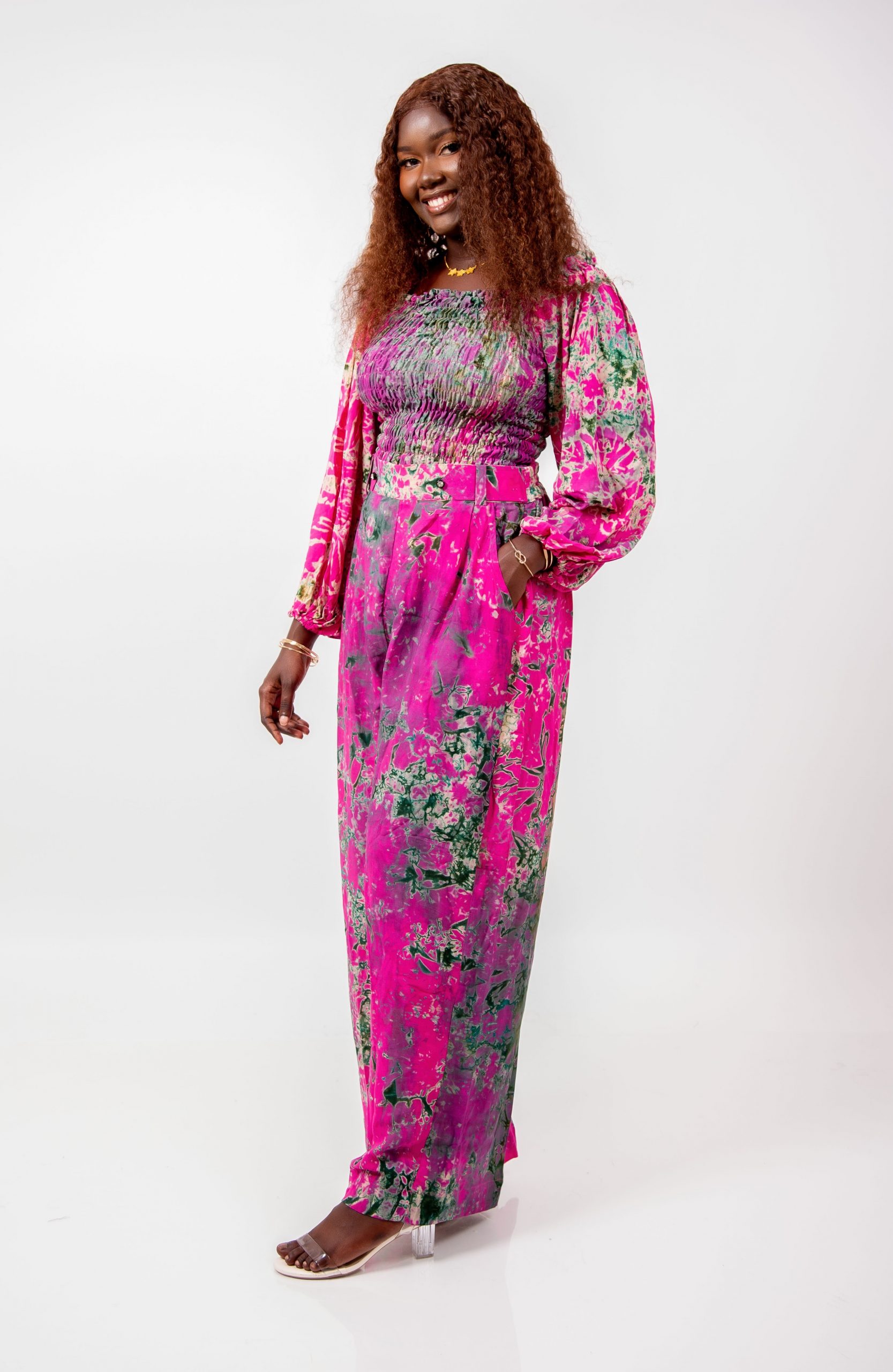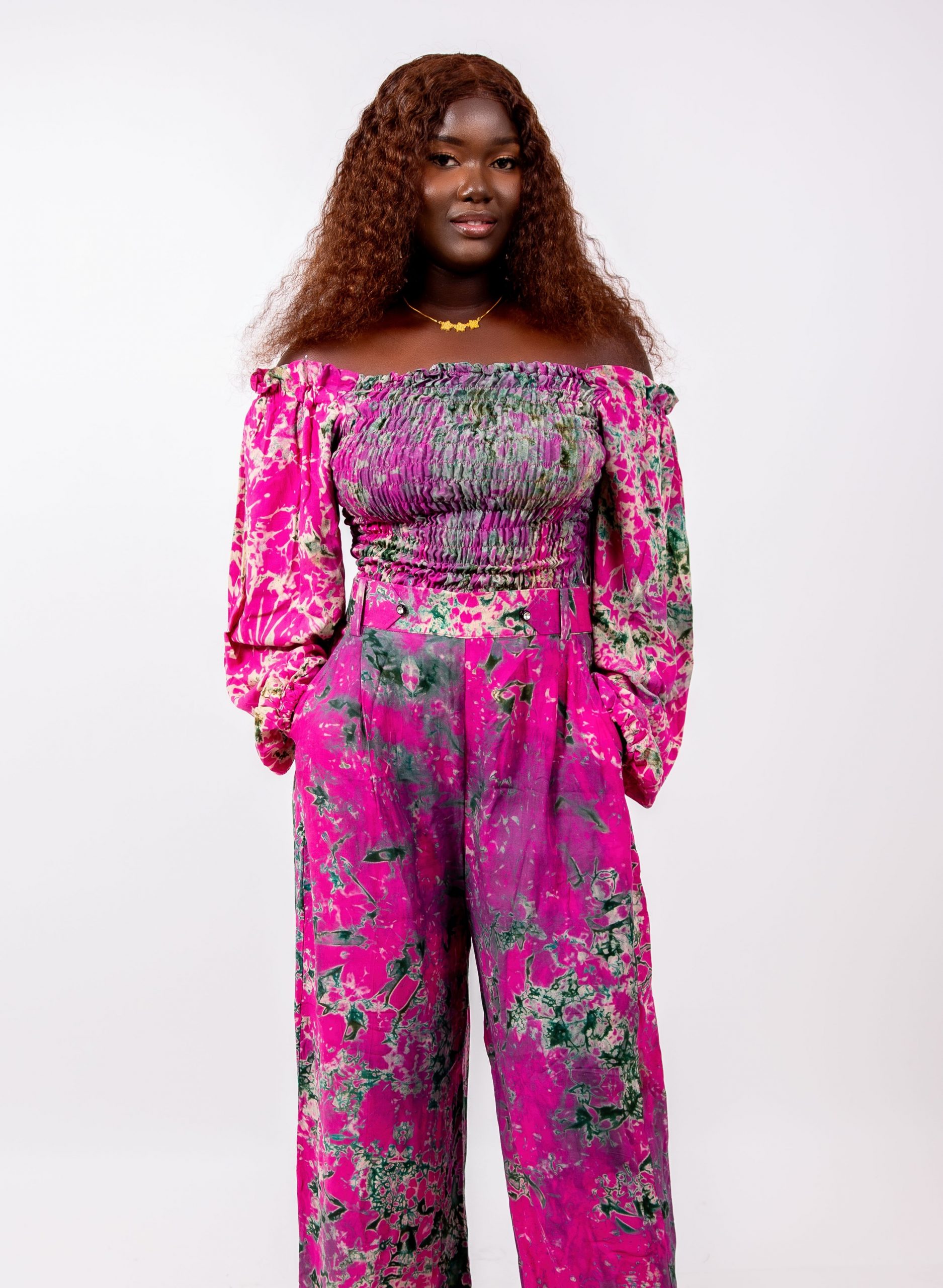 Cet ensemble se distingue par son imprimé artistique spectaculaire mêlant des nuances de rose vif, de vert profond et de touches abstraites. Ce mélange harmonieux crée un effet visuel unique, signature du style Thina-Fashion.