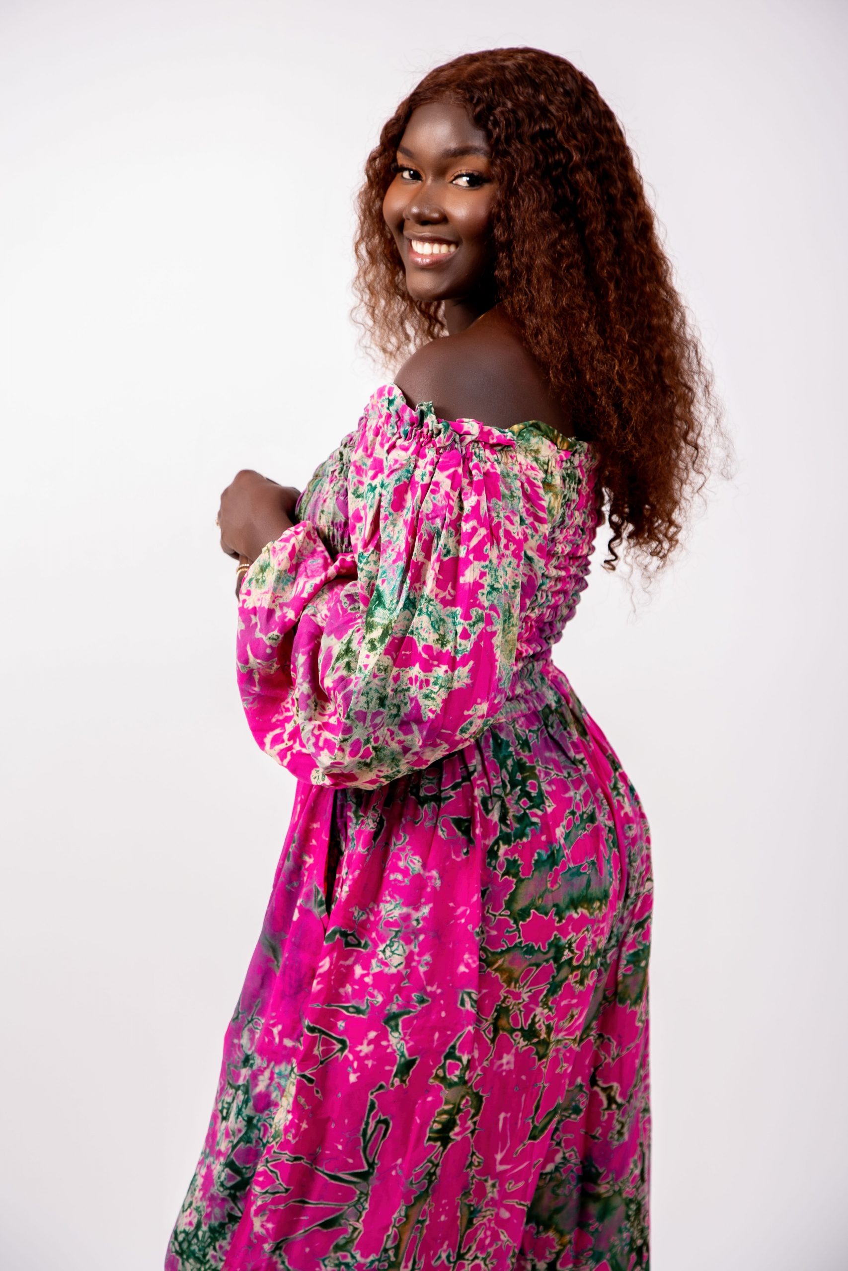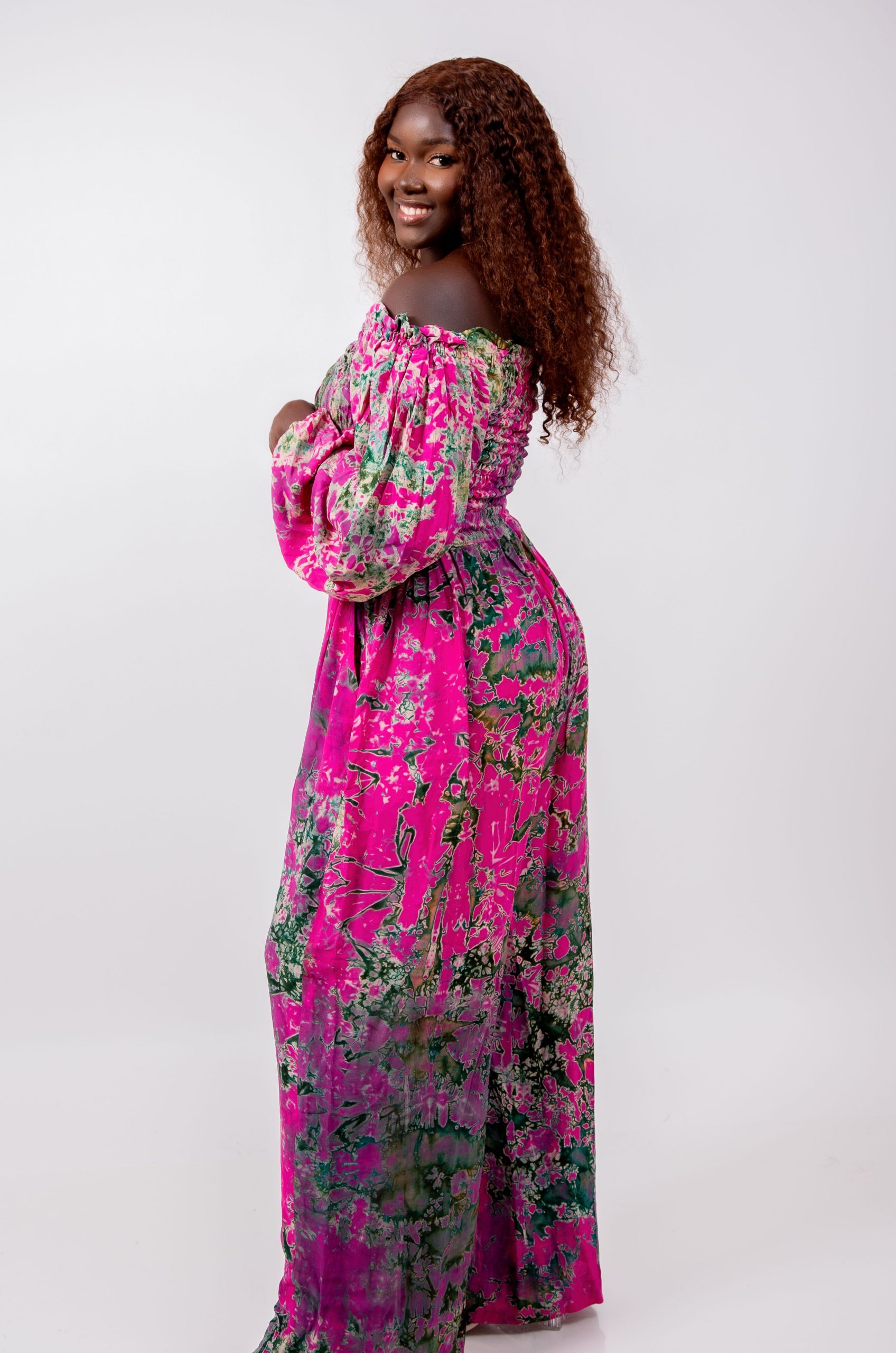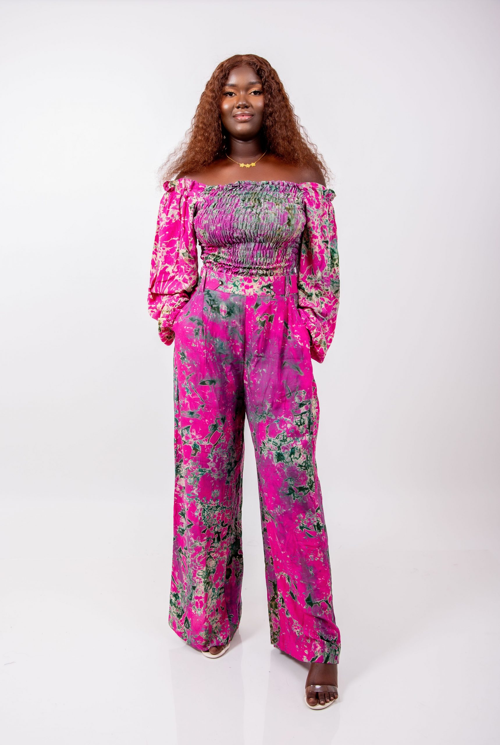 Cet ensemble se distingue par son imprimé artistique spectaculaire mêlant des nuances de rose vif, de vert profond et de touches abstraites. Ce mélange harmonieux crée un effet visuel unique, signature du style Thina-Fashion.