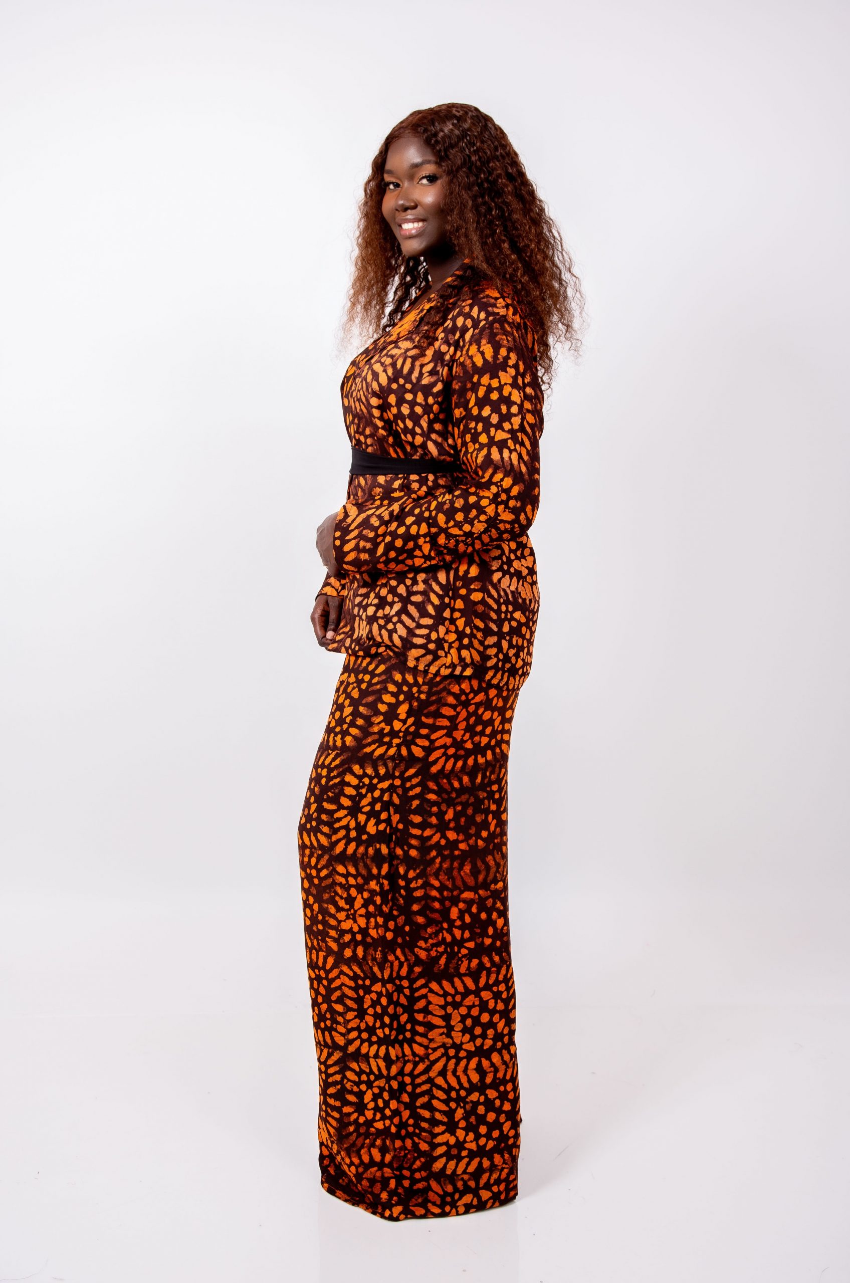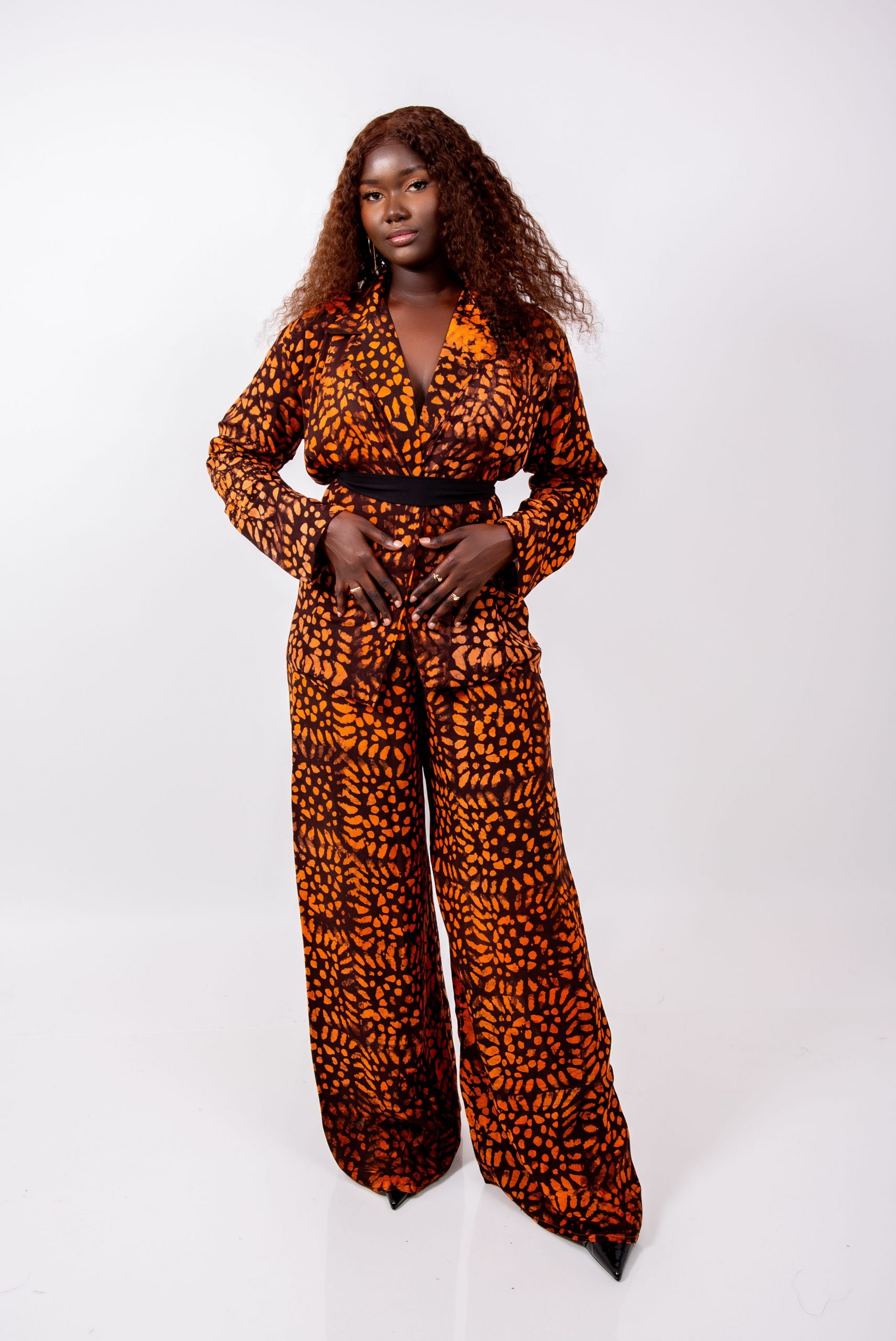 Cet ensemble séduit immédiatement grâce à son imprimé artistique orange et noir, vibrant et puissant, parfait pour les femmes qui aiment se démarquer avec style.