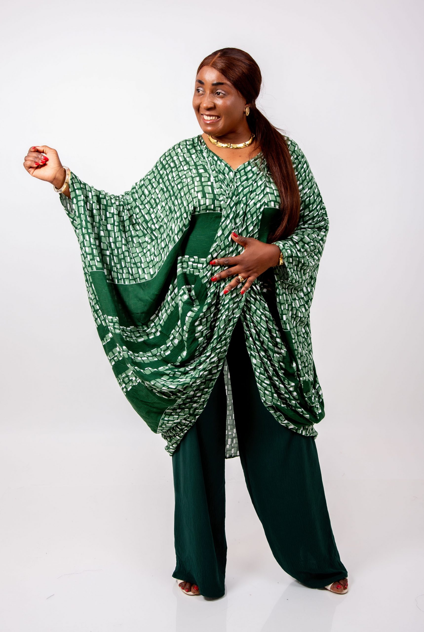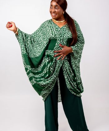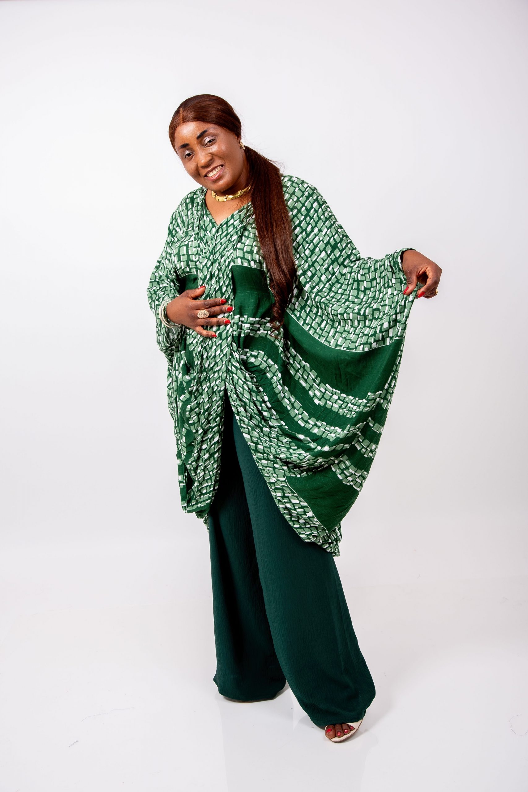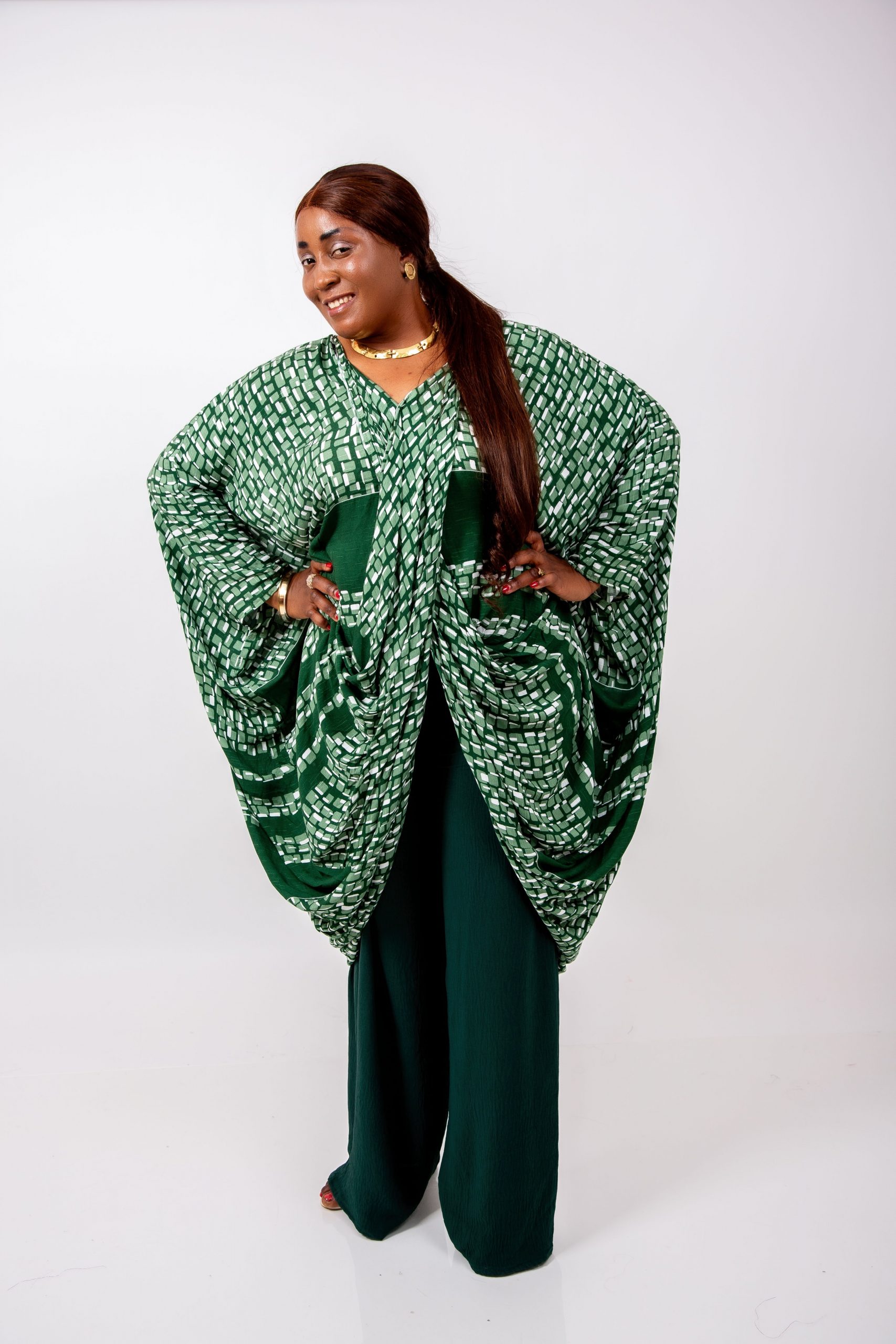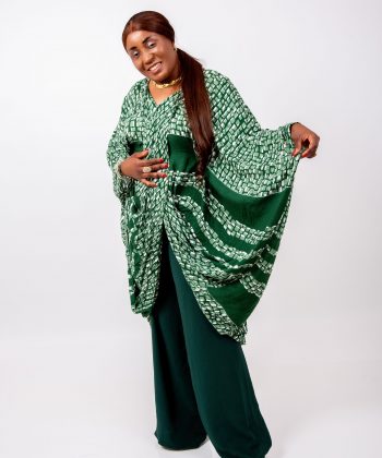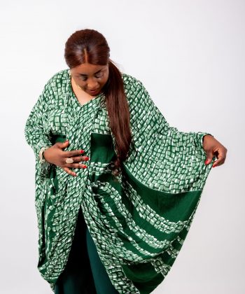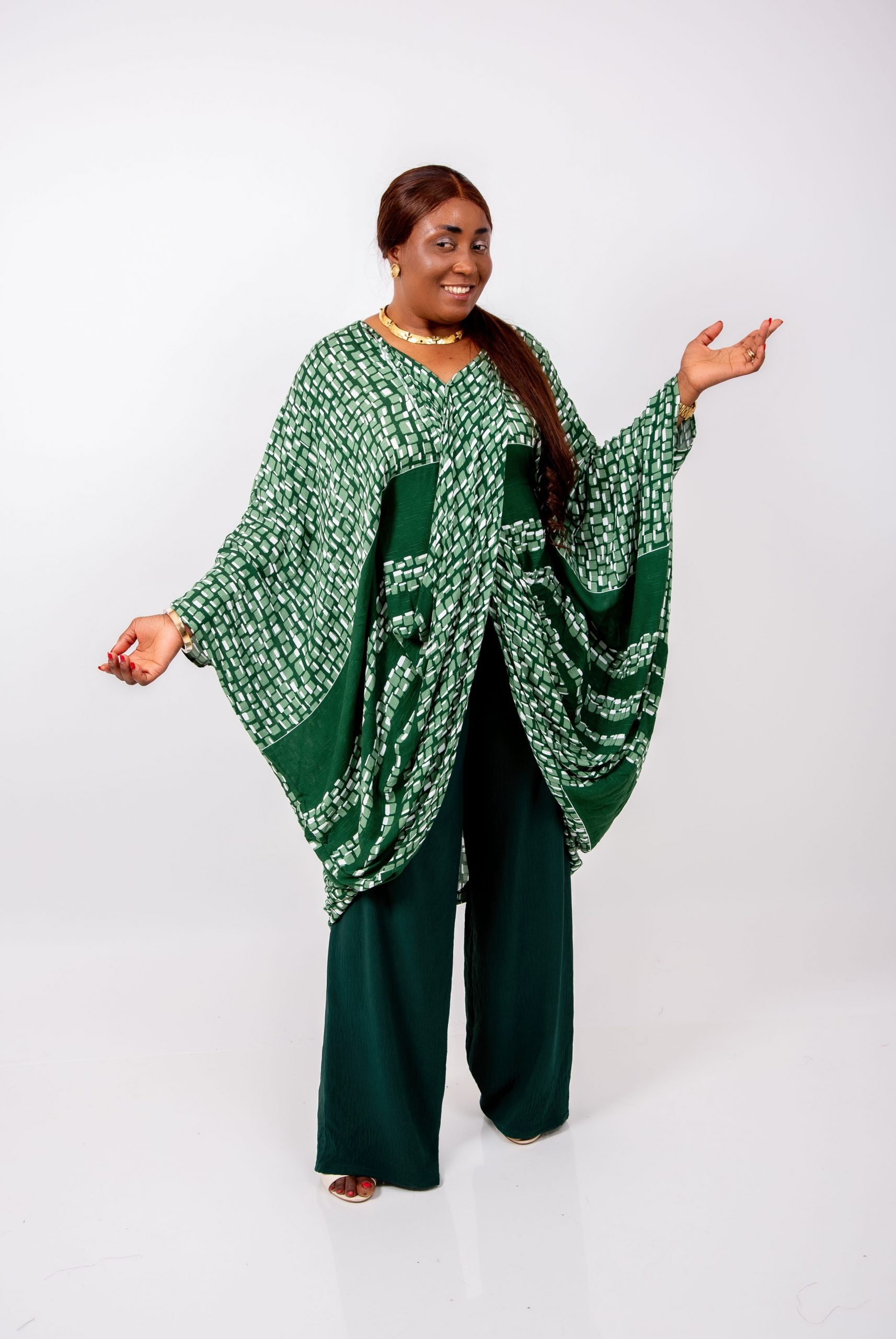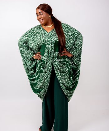 Le haut kaftan, réalisé dans un imprimé vert graphique raffiné, présente une coupe oversize qui offre une liberté totale de mouvement tout en sublimant la silhouette.