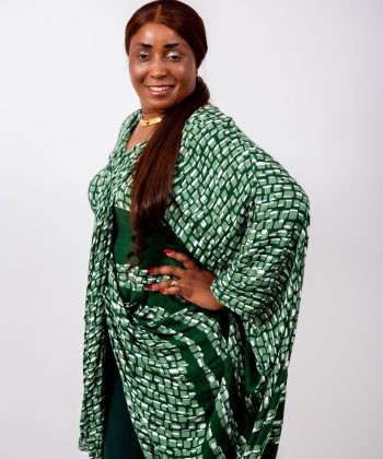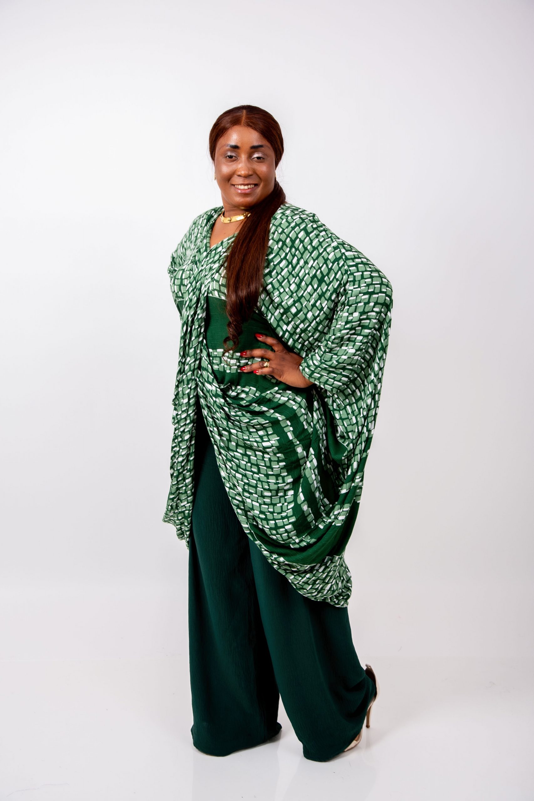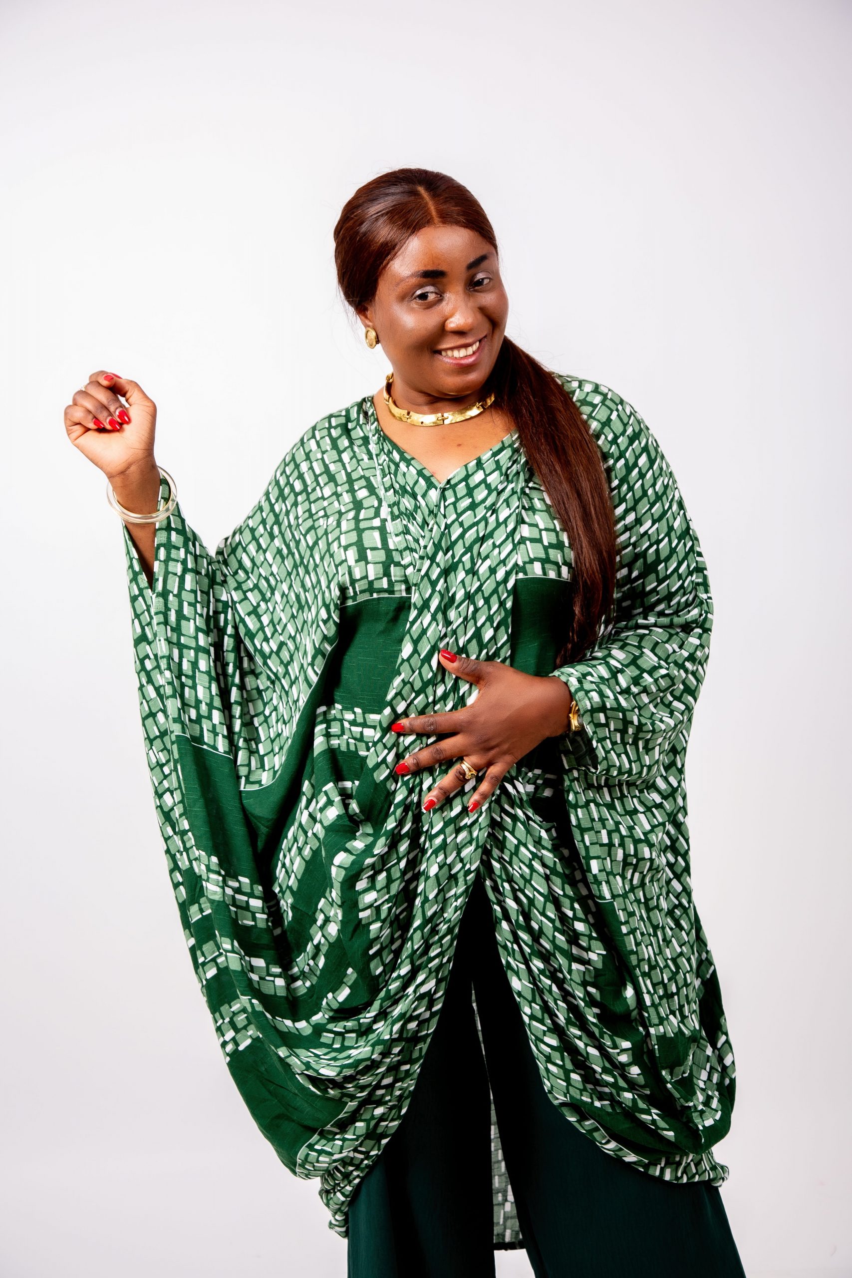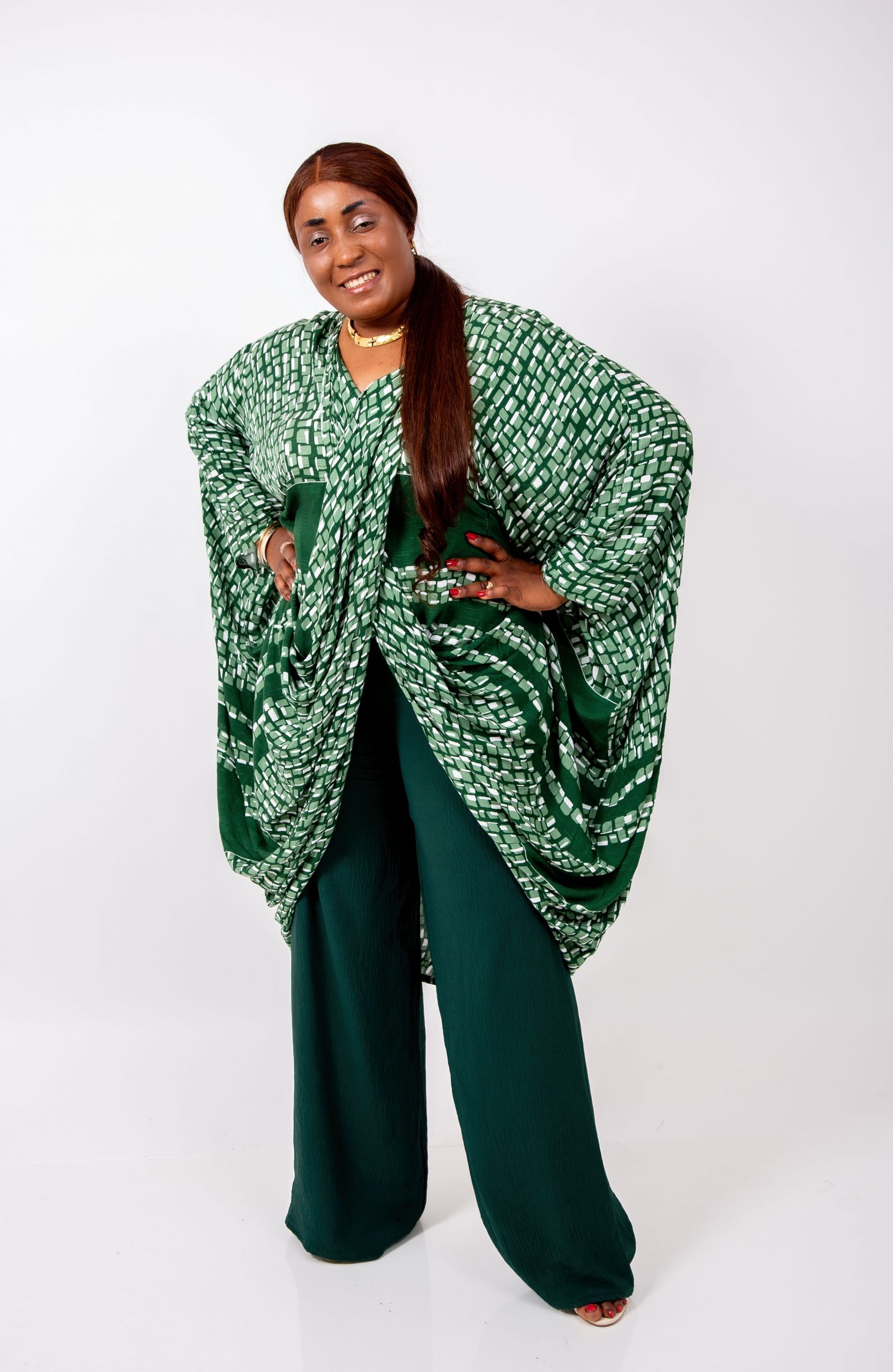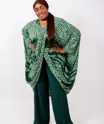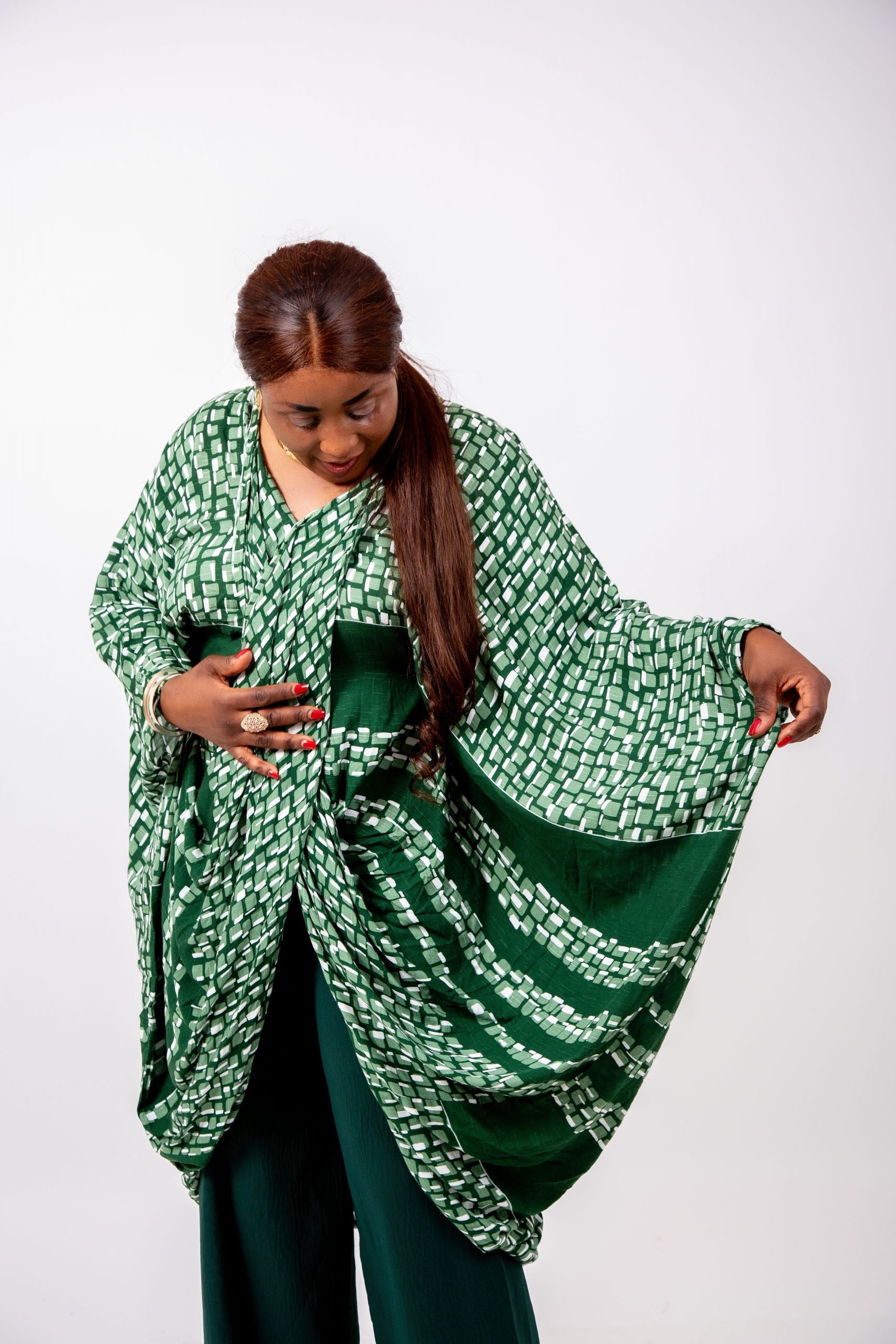 Le haut kaftan, réalisé dans un imprimé vert graphique raffiné, présente une coupe oversize qui offre une liberté totale de mouvement tout en sublimant la silhouette.