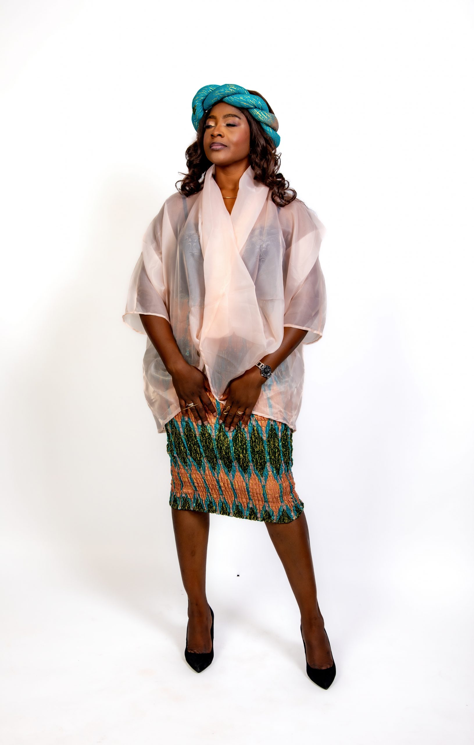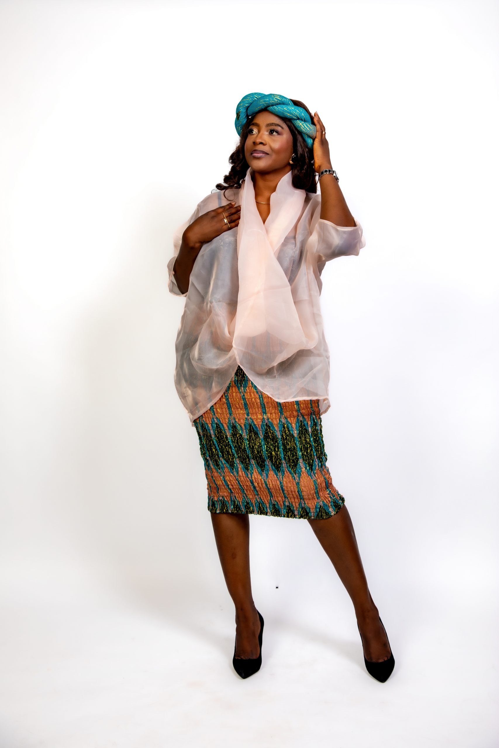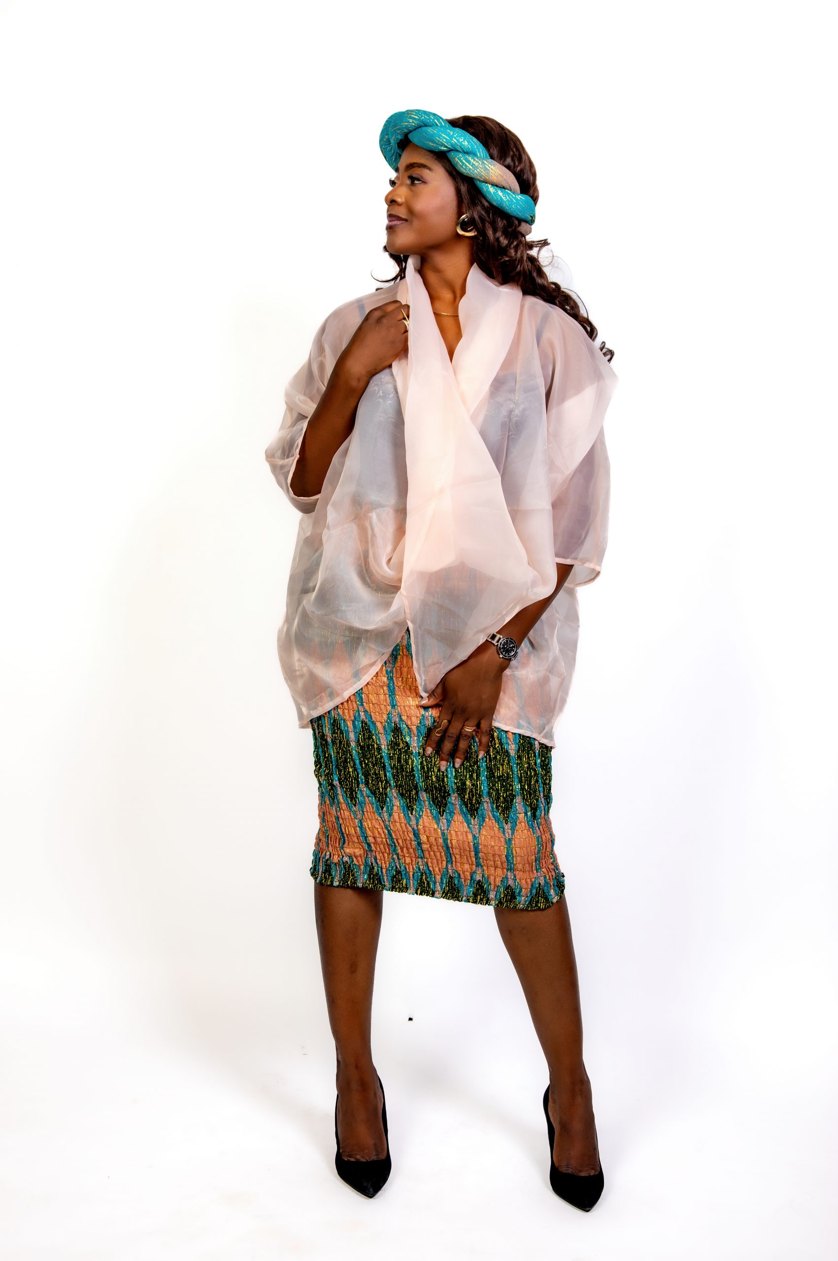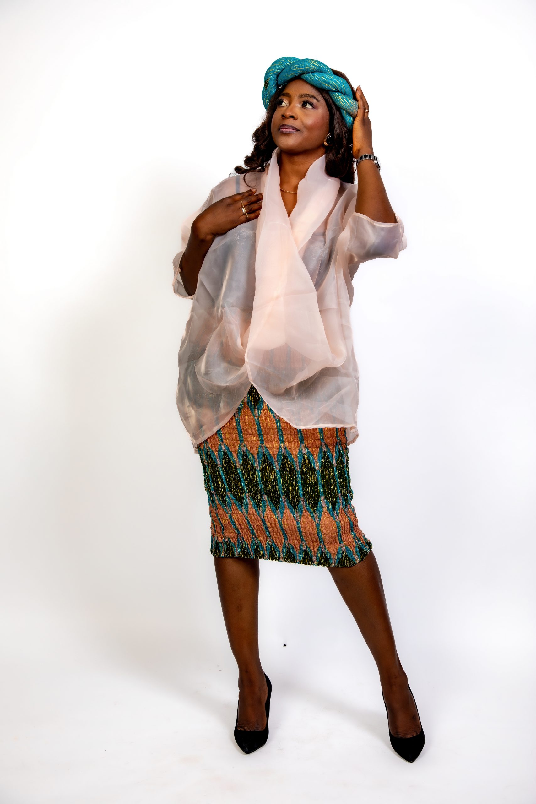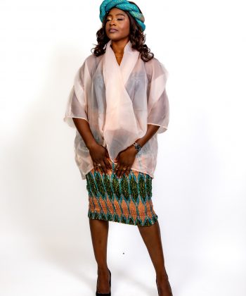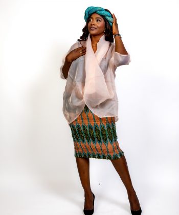 ✨ Un haut en voile transparent couleur pêche, léger, fluide et délicatement drapé. Il apporte une touche de douceur et de modernité, équilibrant parfaitement la richesse visuelle du Kente.
