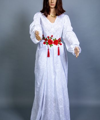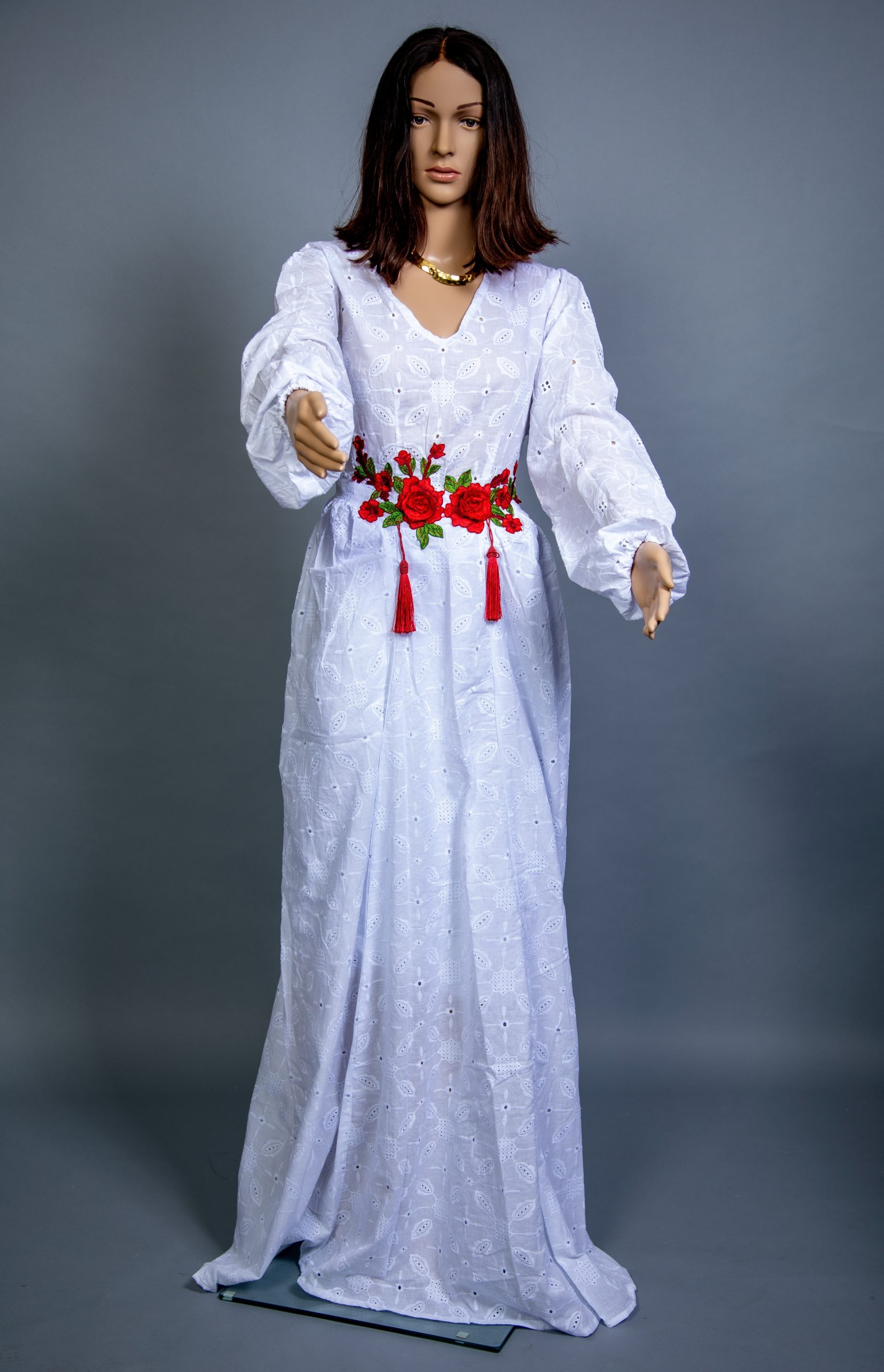 Son atout majeur : une ceinture ornée de roses rouges brodées, accompagnées de feuilles vertes et de petits pompons rouges qui ajoutent une touche pétillante et romantique. Cette association de blanc immaculé et de rouge éclatant crée un contraste visuel magnifique, parfait pour attirer tous les regards.