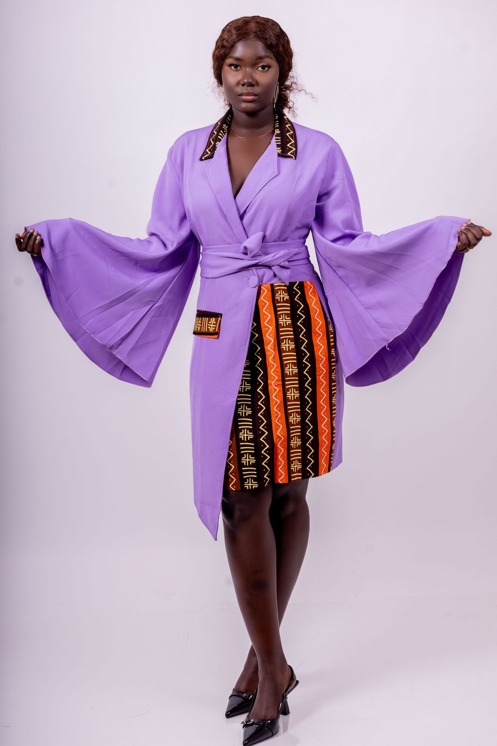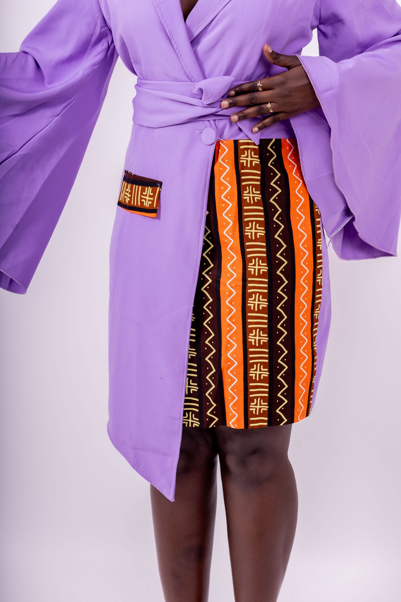 Le détail qui fait la différence : les empiècements wax modernes sur le côté et au niveau du col. Ces motifs africains graphiques ajoutent une touche culturelle chic typique de Thina-Fashion, rendant la robe unique et iconique.