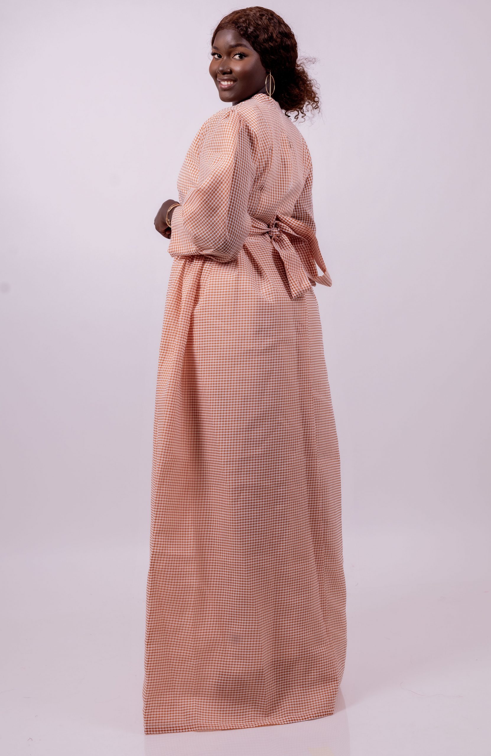 Cette robe longue se distingue par son tissu à carreaux fins beige et caramel, offrant une allure subtilement vintage et ultra élégante.
