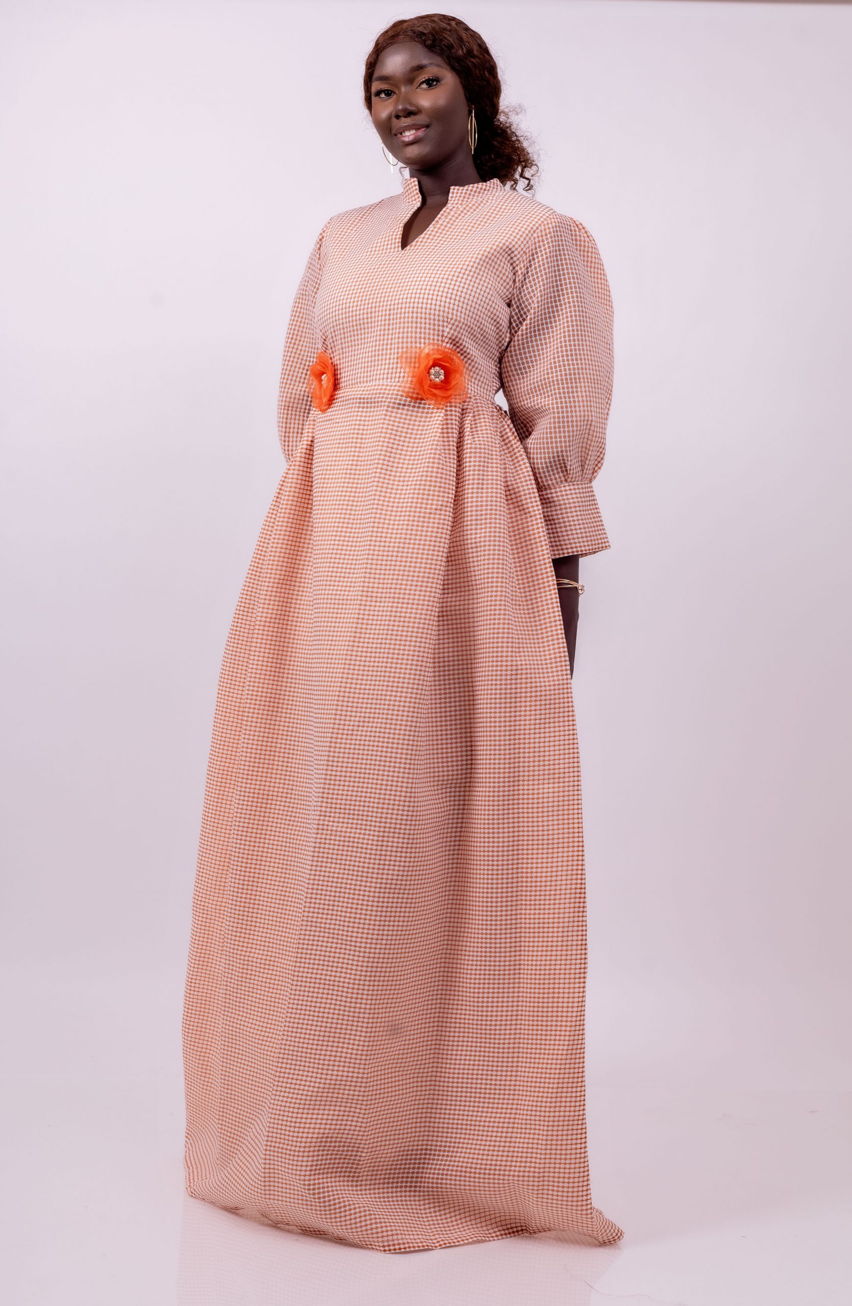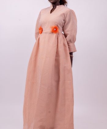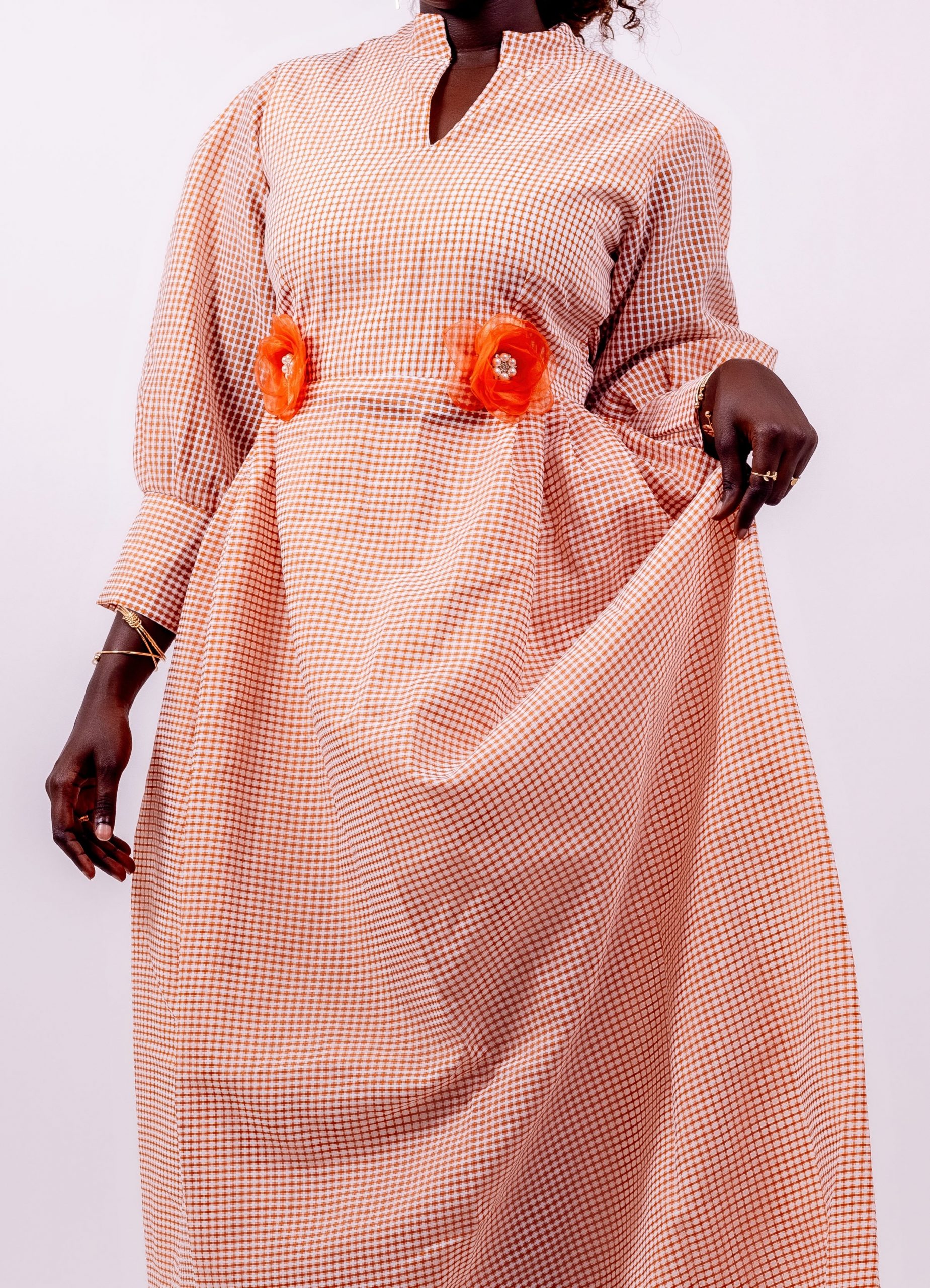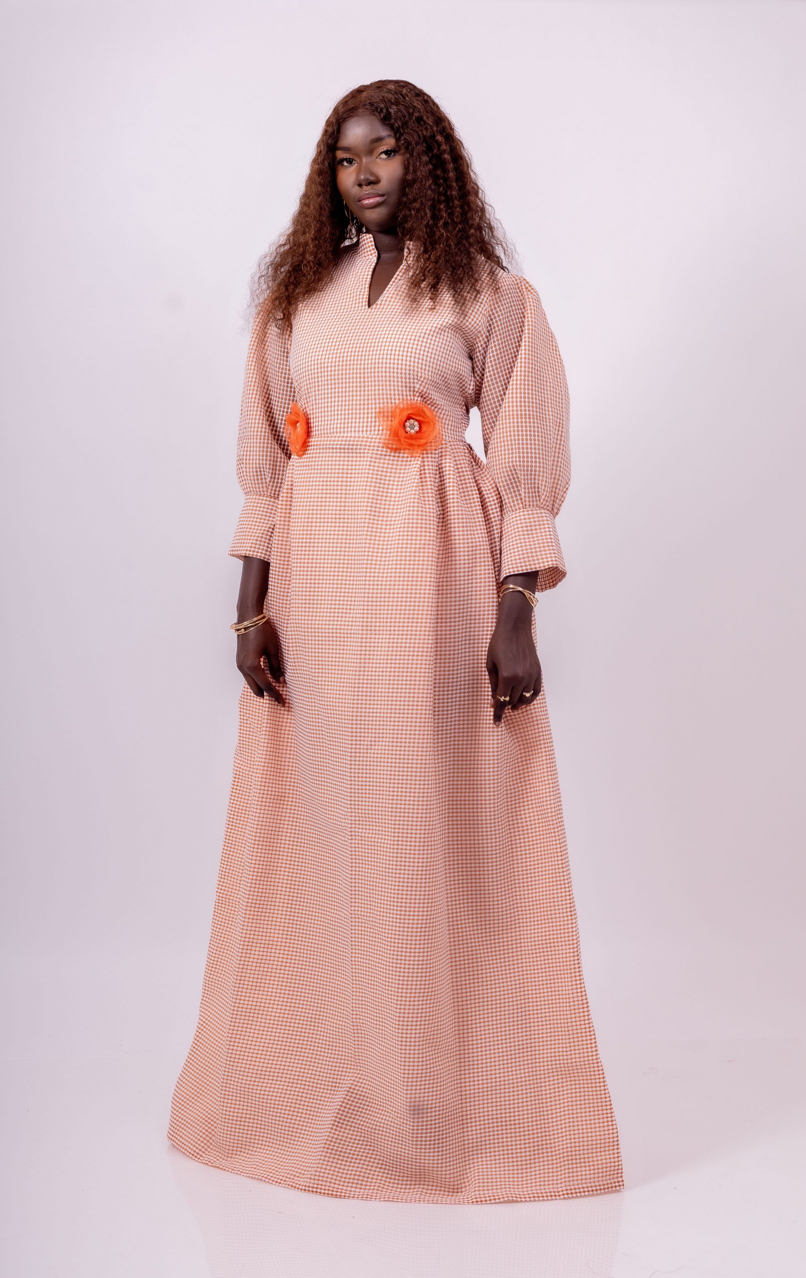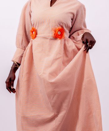La taille est délicatement mise en valeur par deux fleurs décoratives orange, apportant une note de couleur et un charme unique typique des créations Thina-Fashion.