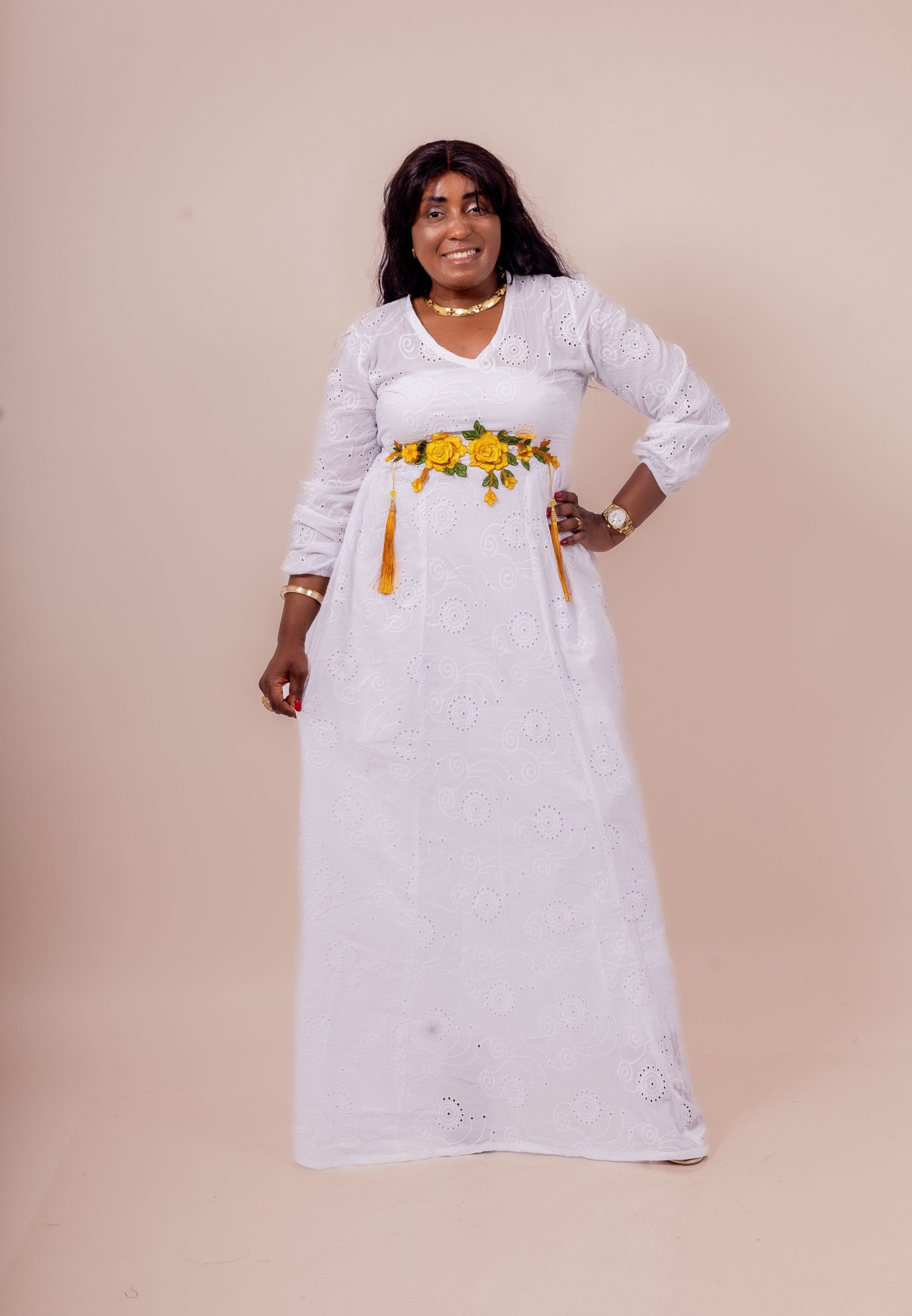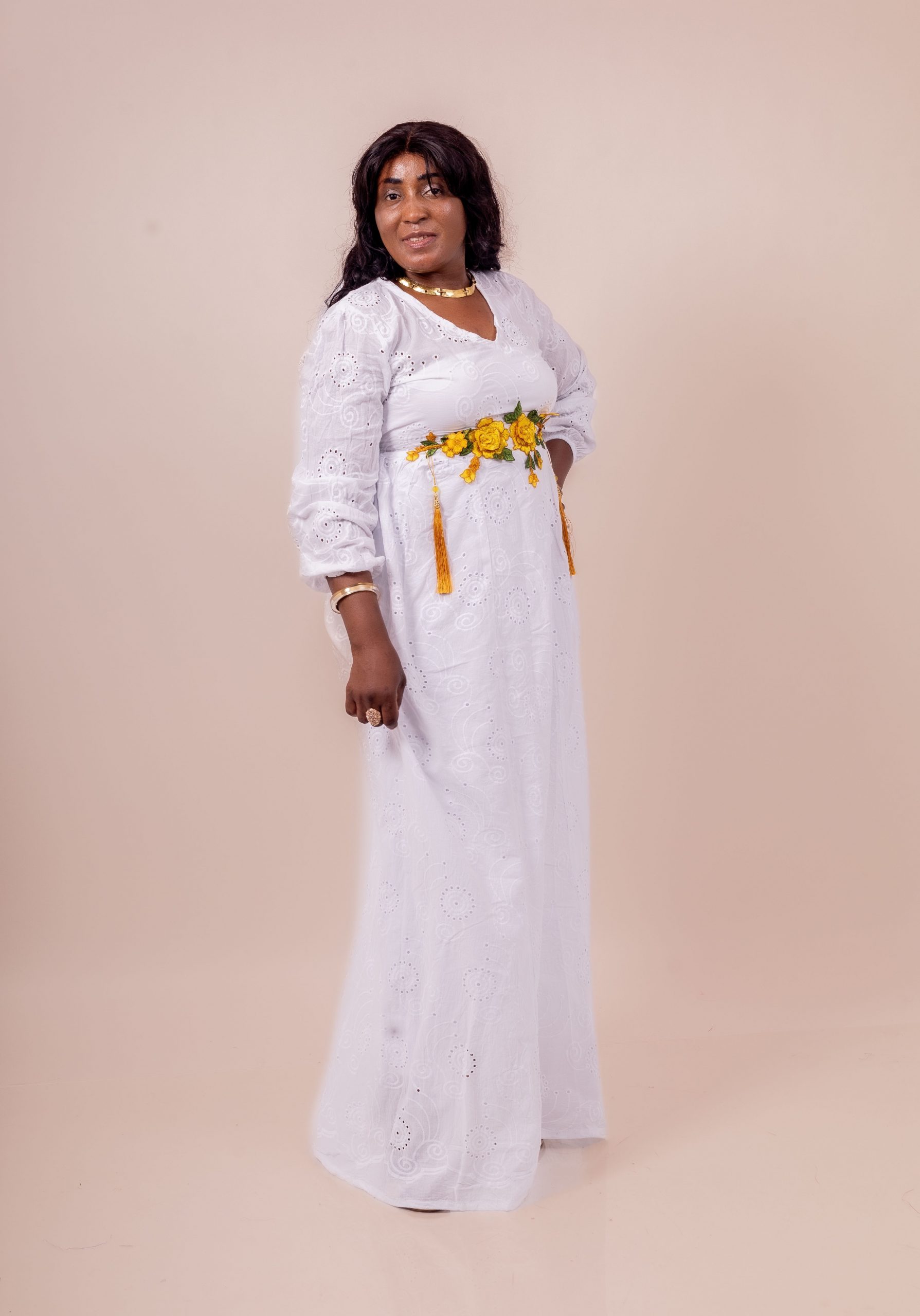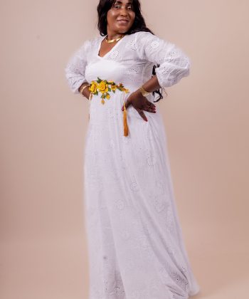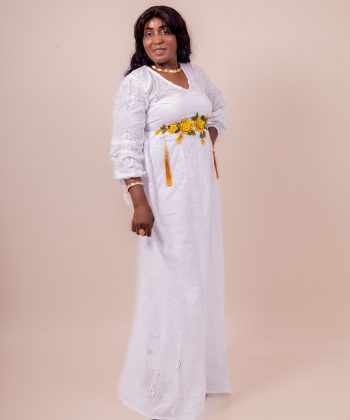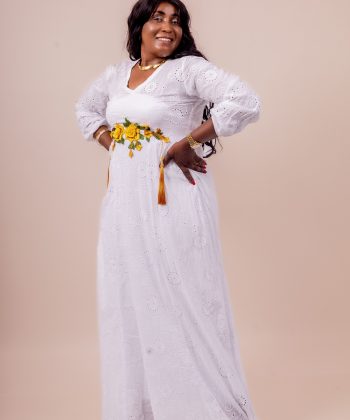 Thina-Fashion – Robe Longue Blanche “Rosalia” Brodée & Fleurie Jaune