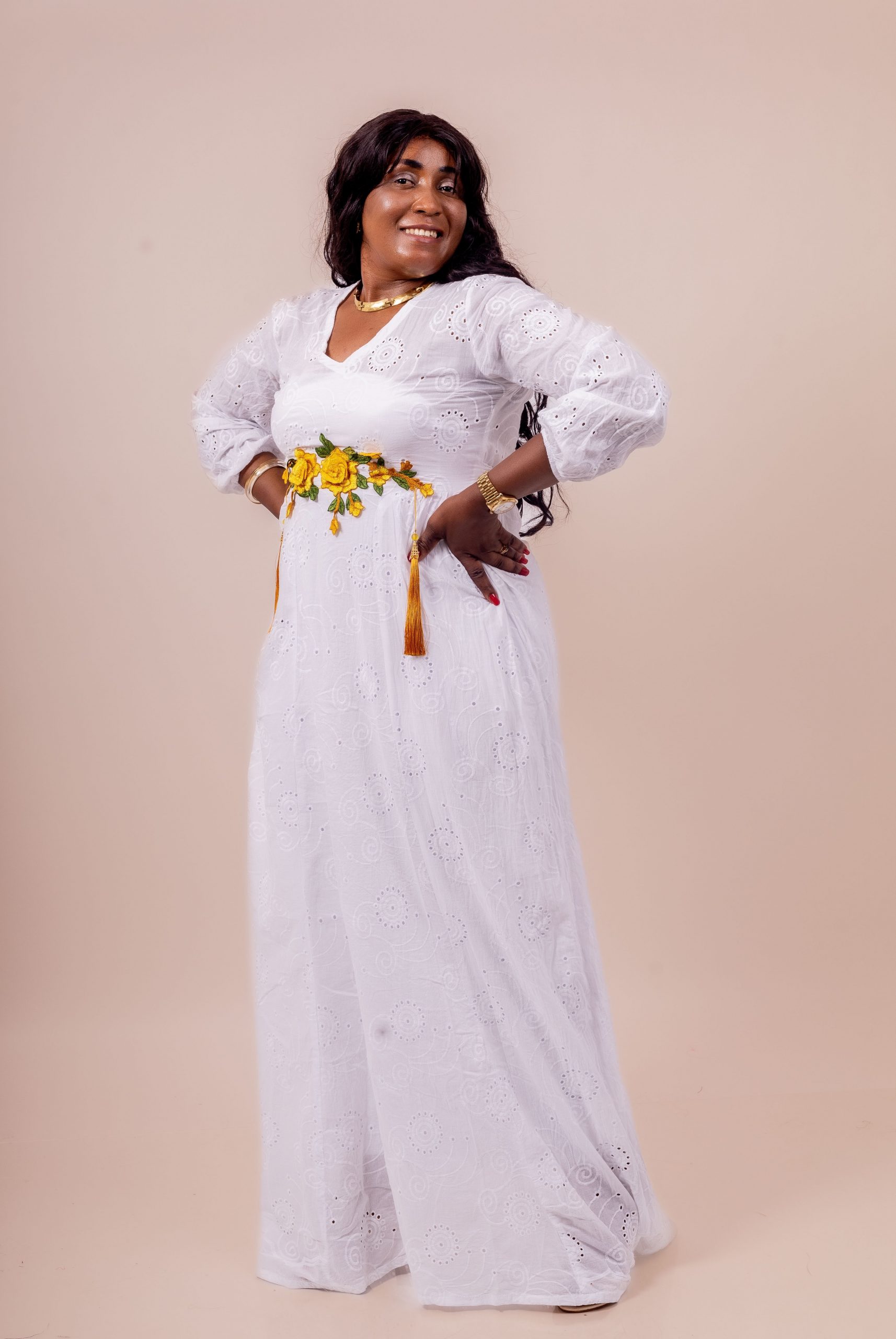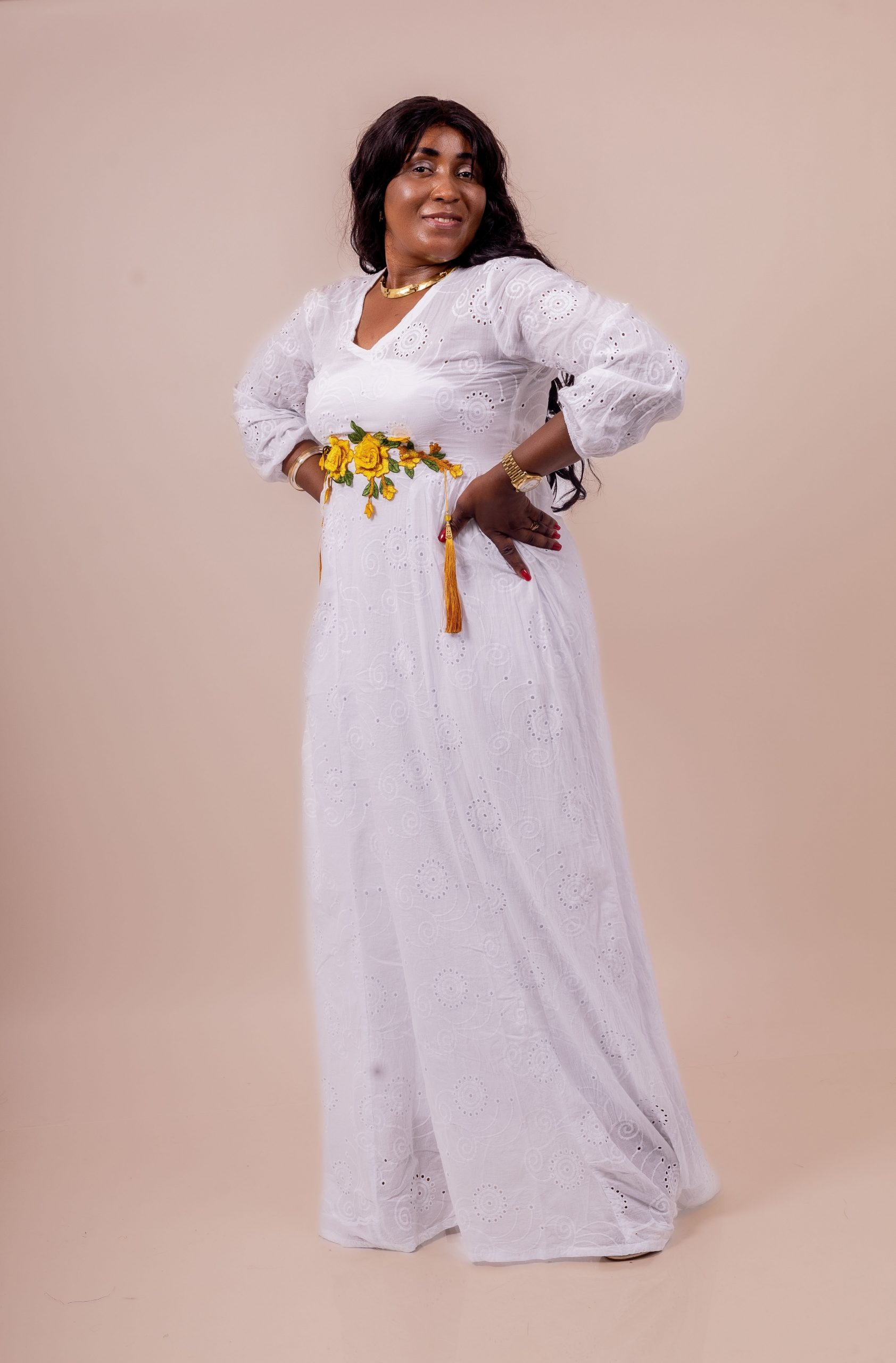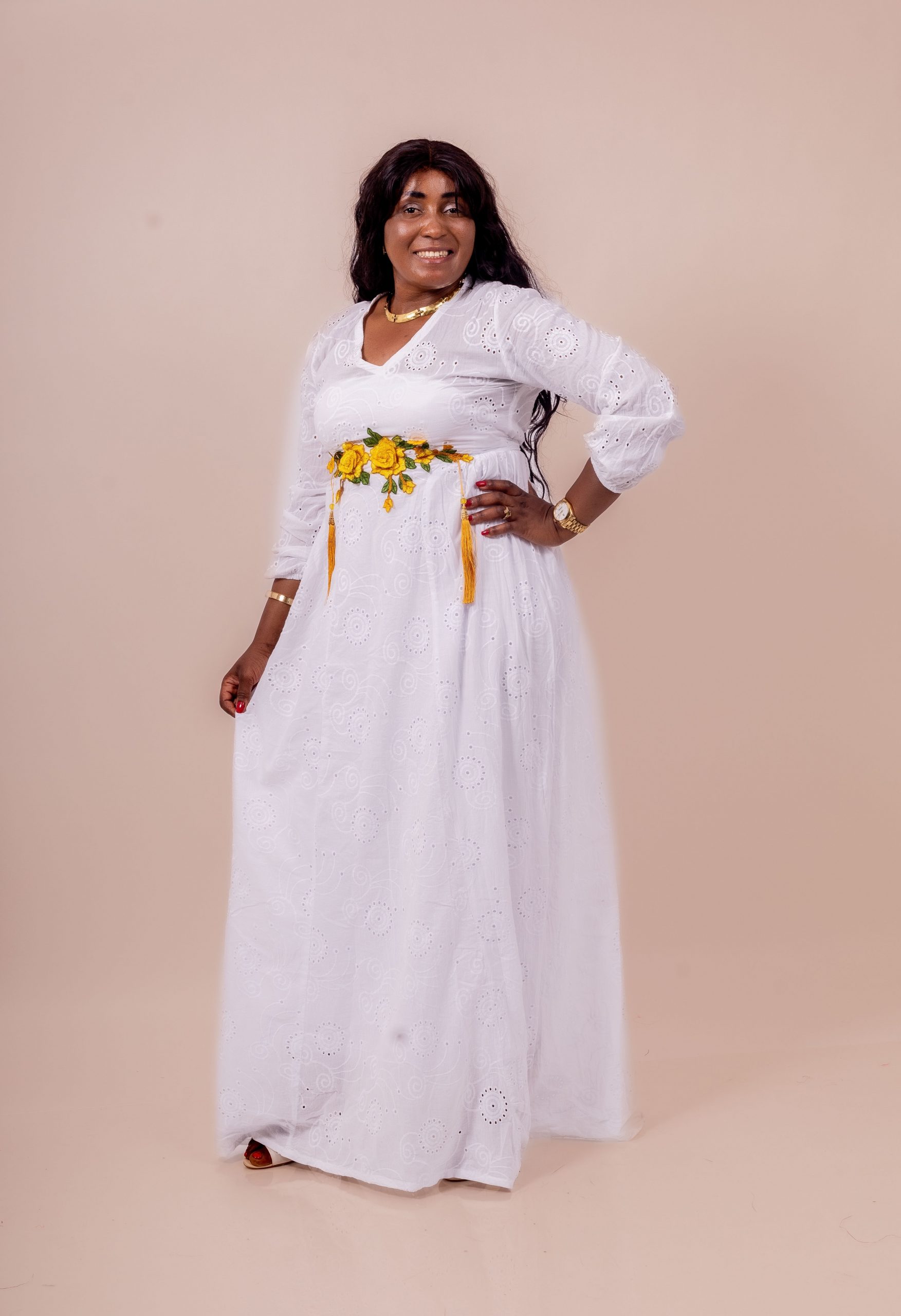 Thina-Fashion – Robe Longue Blanche “Rosalia” Brodée & Fleurie Jaune