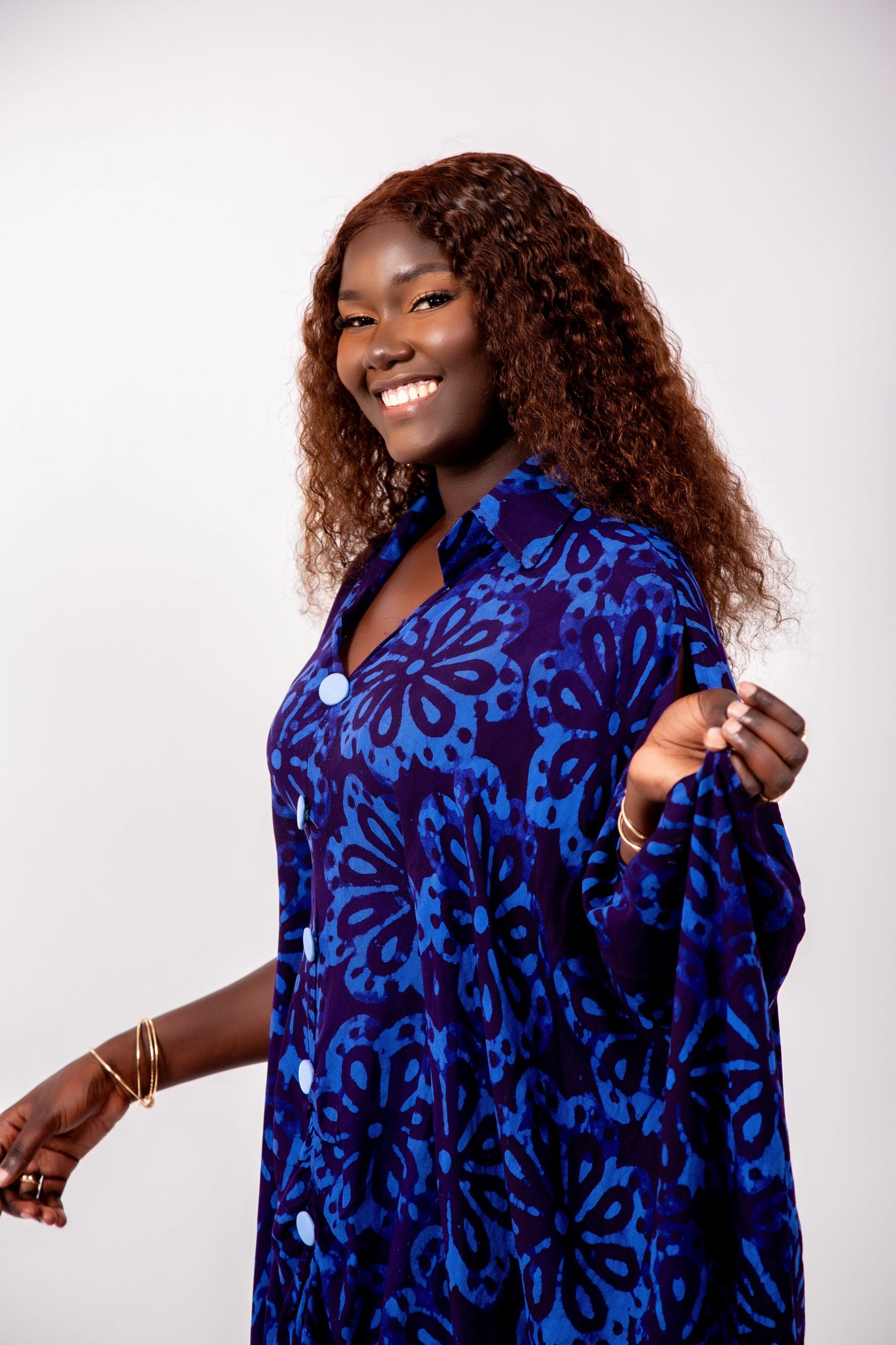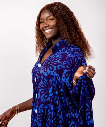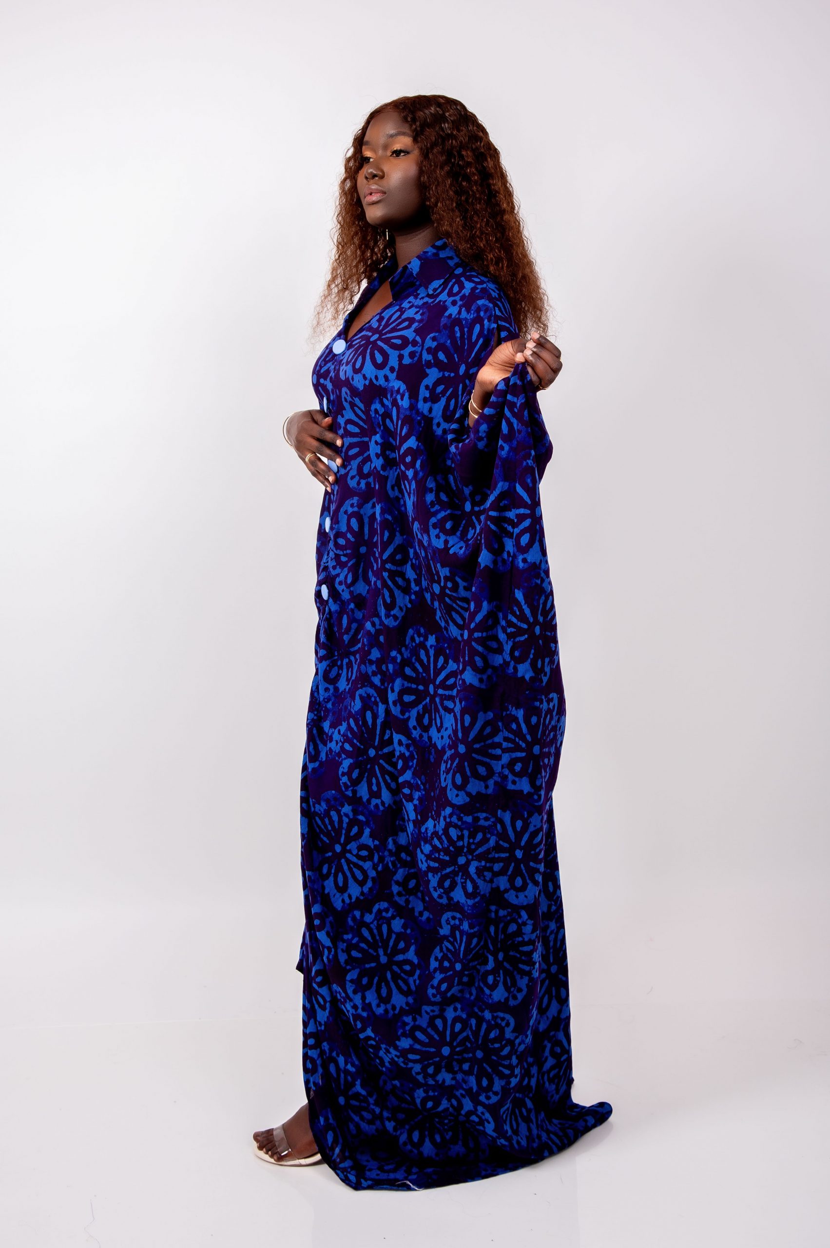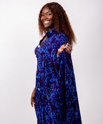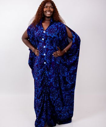 Son tissu fluide et léger, habillé d’un imprimé floral bleu roi, apporte une allure majestueuse et moderne. La coupe ample permet un mouvement naturel et gracieux, idéal pour toutes les morphologies.