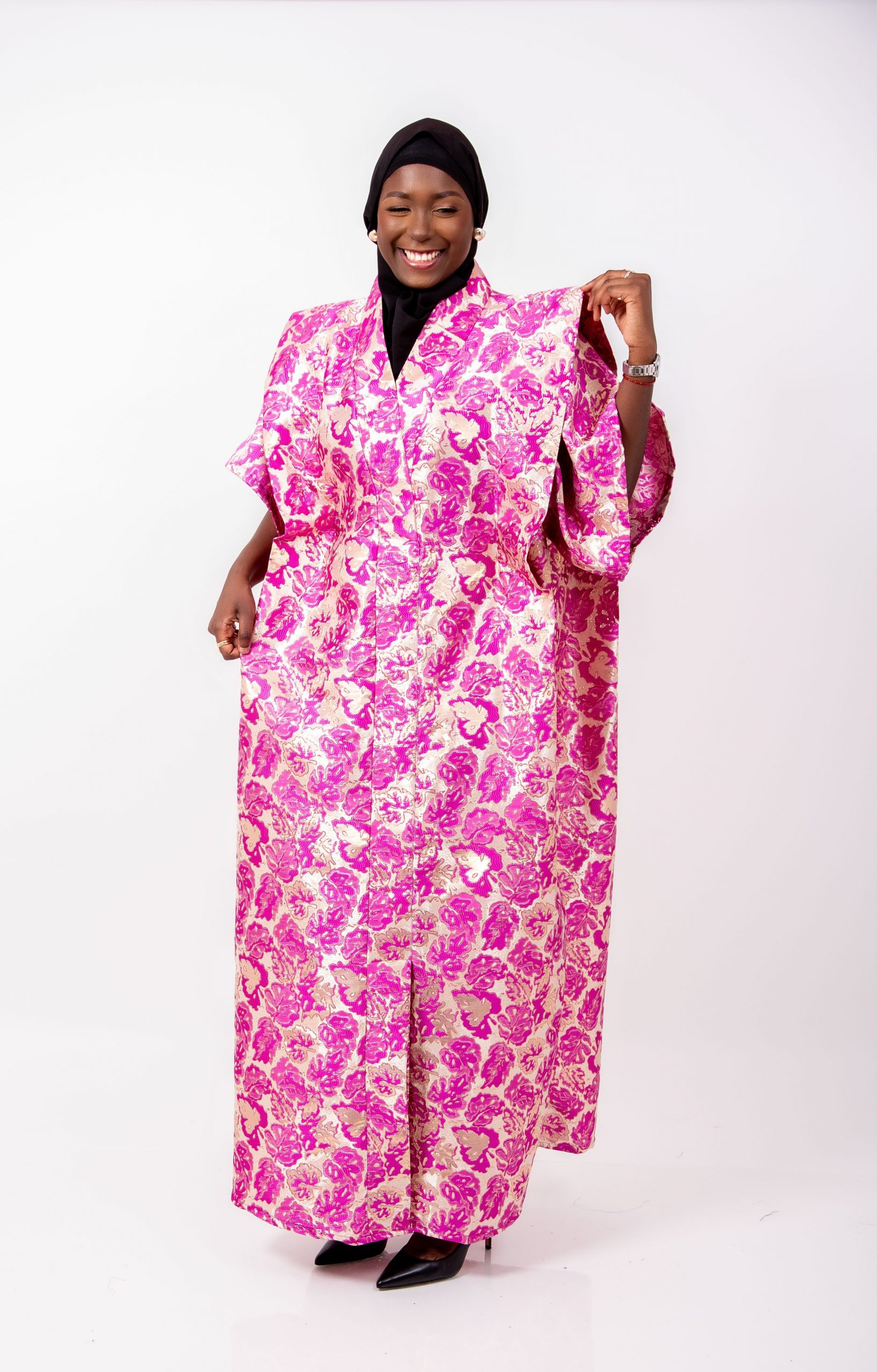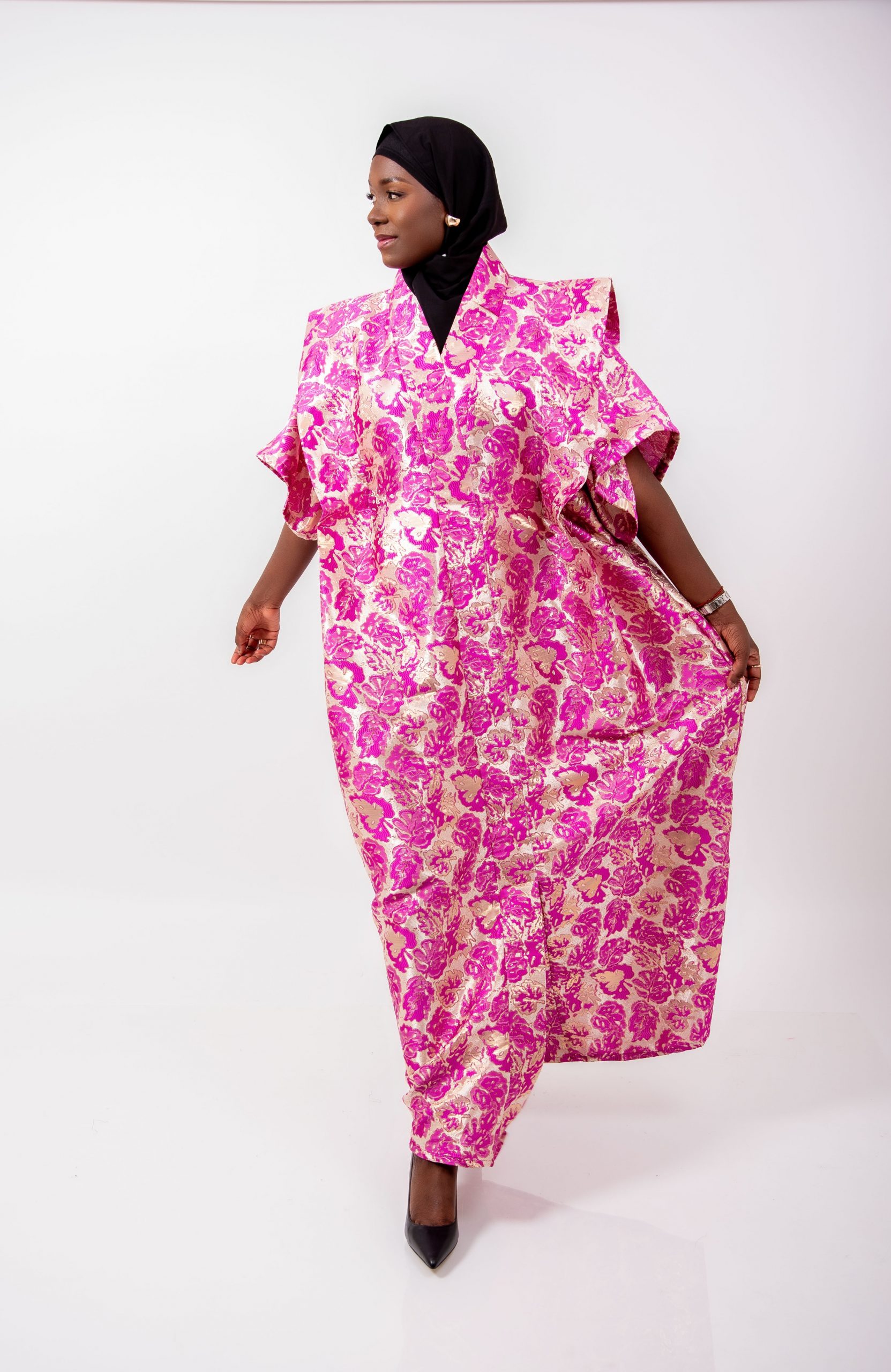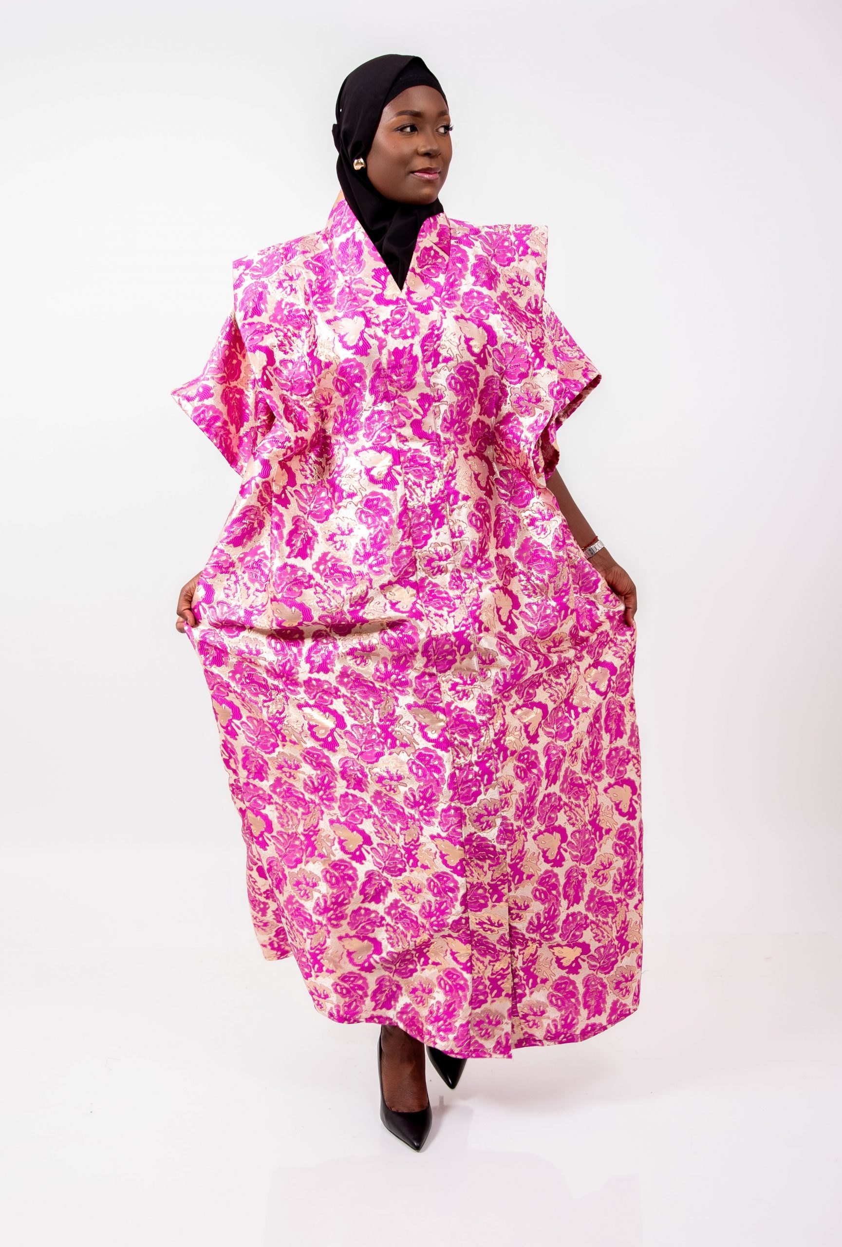 Réalisé en brocard haut de gamme, ce boubou se distingue par ses motifs floraux rose fuchsia sur fond doré, offrant un rendu somptueux, chic et ultra féminin. Le tissu brocard apporte un tombé structuré et noble, tandis que la coupe ample signature Thina-Fashion assure confort et aisance en toutes circonstances.